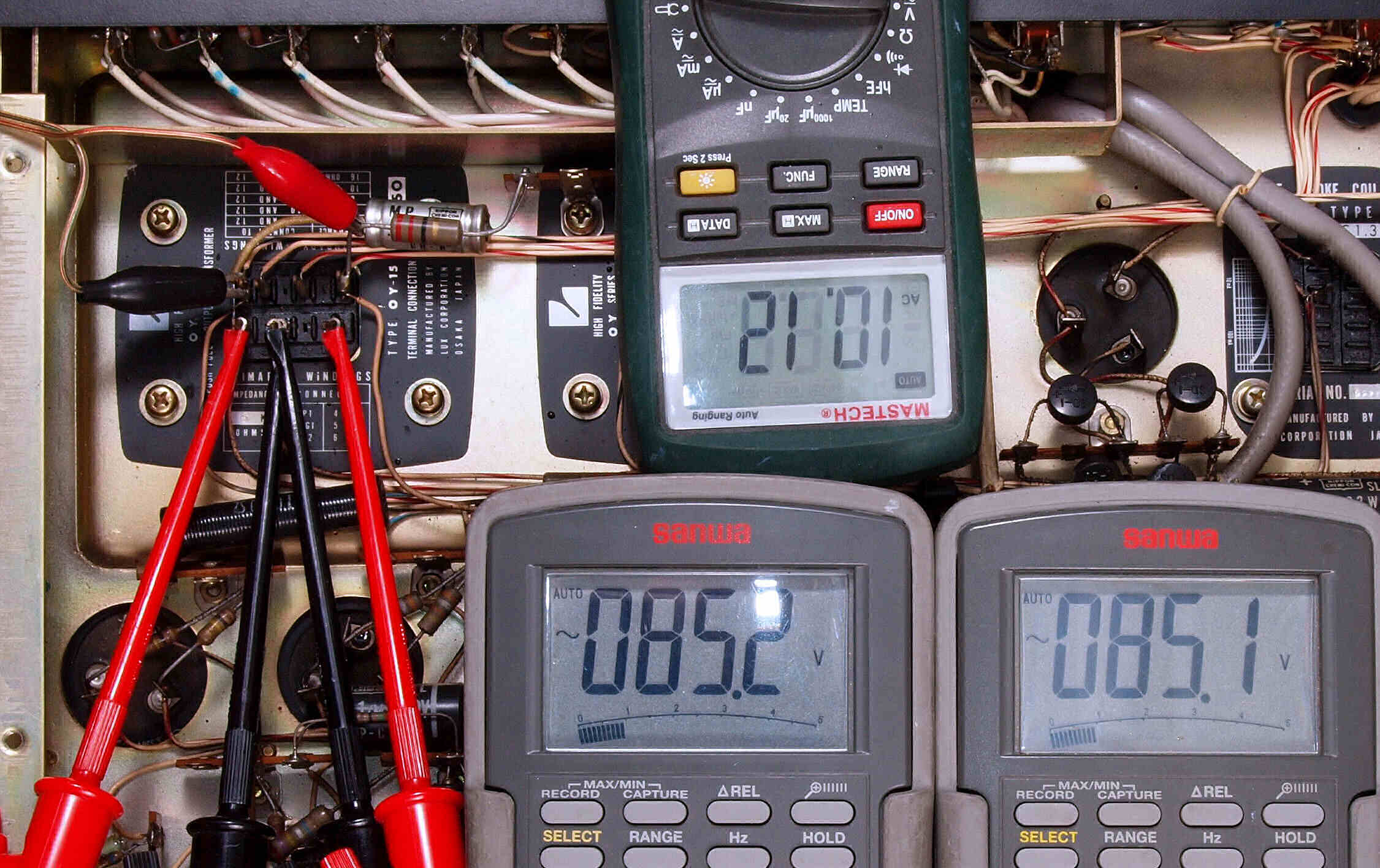 | L51. 点検中 右側出力トランス電圧測定。 16Ω端子にAC10Vを入力し、1次巻き線P1−B1間電圧=85.2V、P2−B2間電圧=85.1V。 |