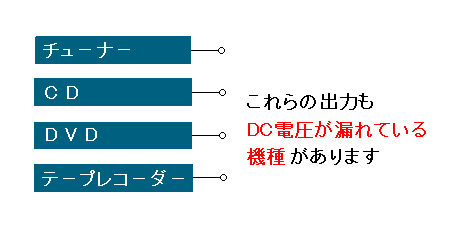 | X CD・DVD・MD・チューナ等の一般機器は大丈夫か チューナ・CD・DVD・MD・テープレコーダ、等のRCA出力からDC電圧が漏れている機種があります |