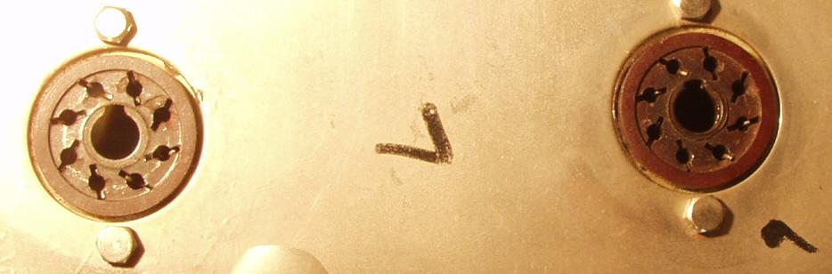 | 14. 黒=電極が1面しかない古いソケット 白=熱伝導の良い、ステアータイト(磁器)製 前段の真空管ソケットも出来れば交換したい、この接触不良の衝撃は、すさまじいレベルで終段真空管を襲う このAMPの修理はこちら |