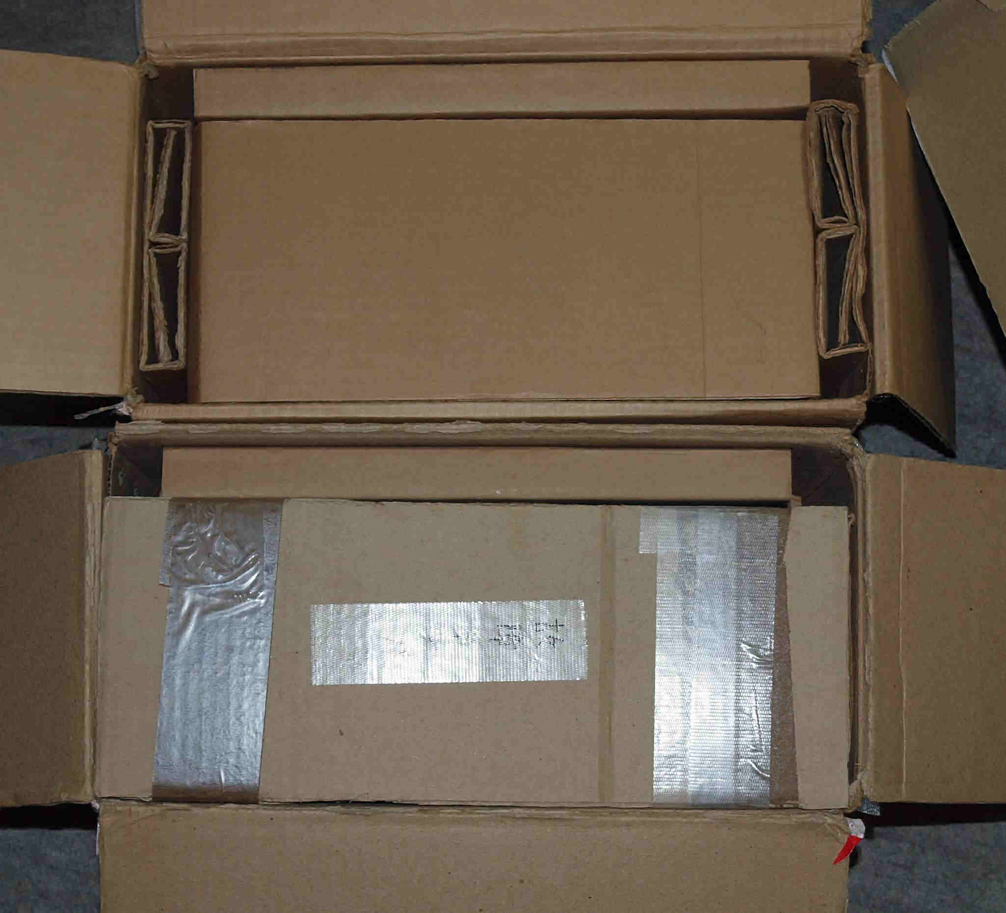 架台に固定し、木箱で覆い、ダンボールで梱包した例   修理の様子はこちら