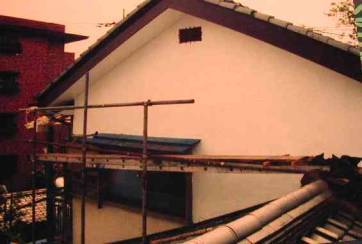 2.足場鋼管で構築、雨樋も修理、塗装する。