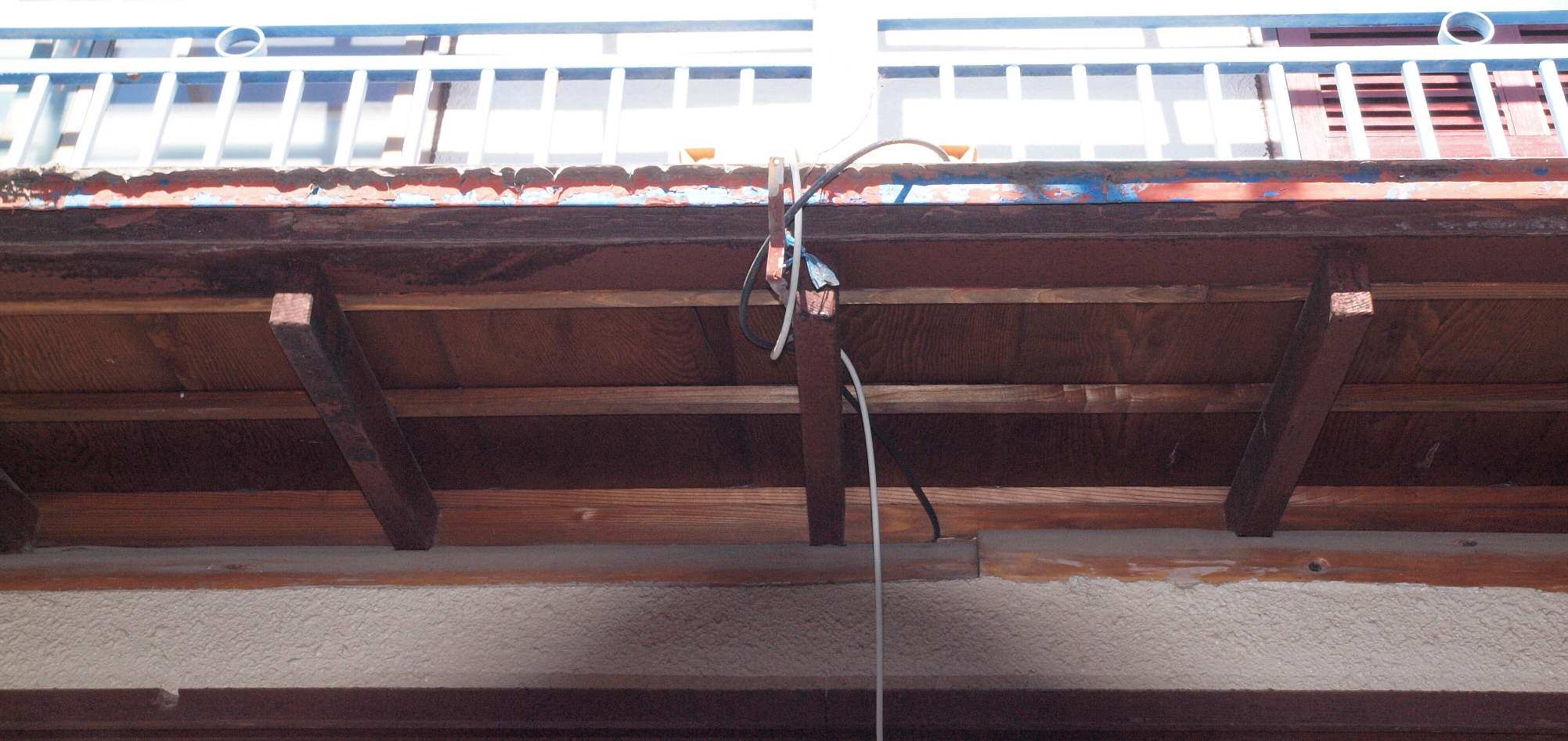 | 56. 修理中 1F南側軒天西端、 腐った垂木の補強完成。 反対側から見る。 |