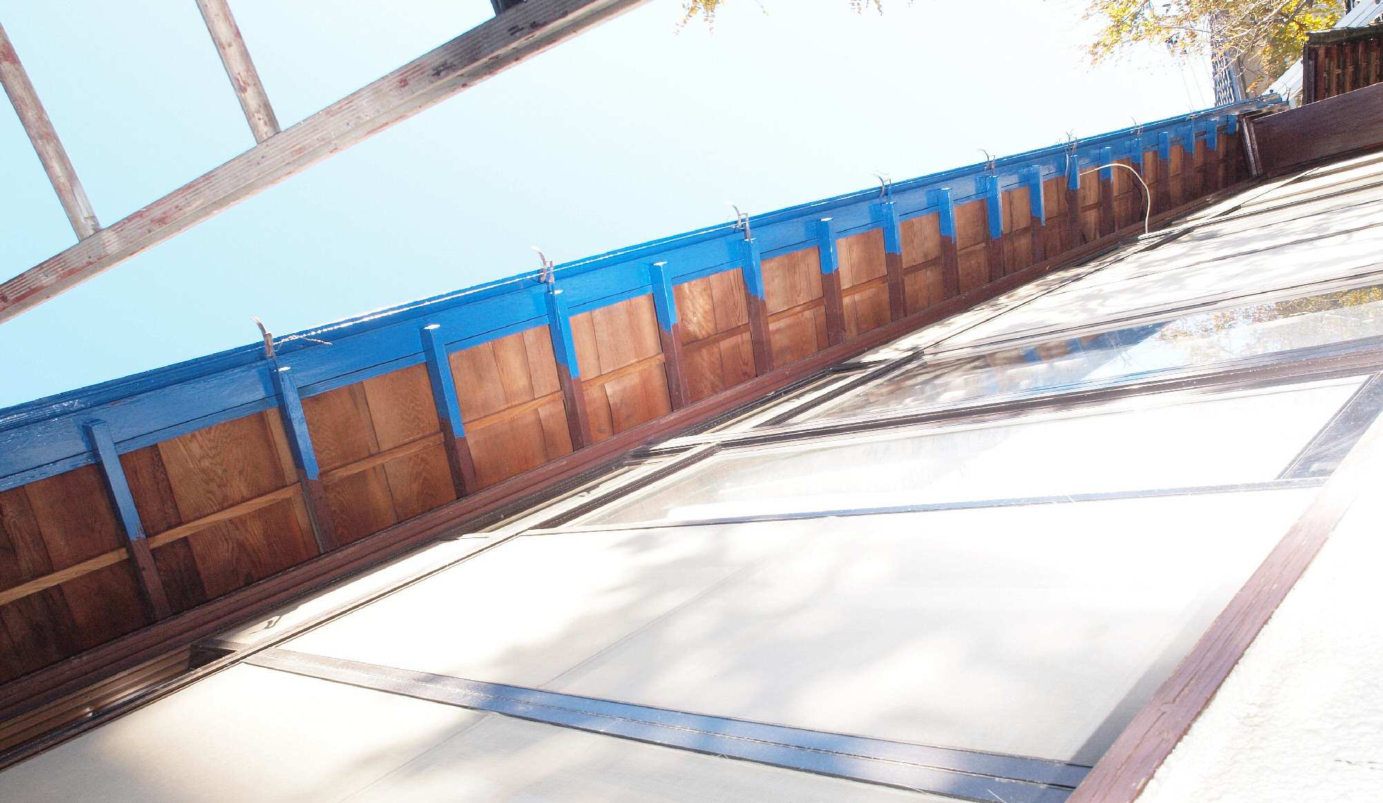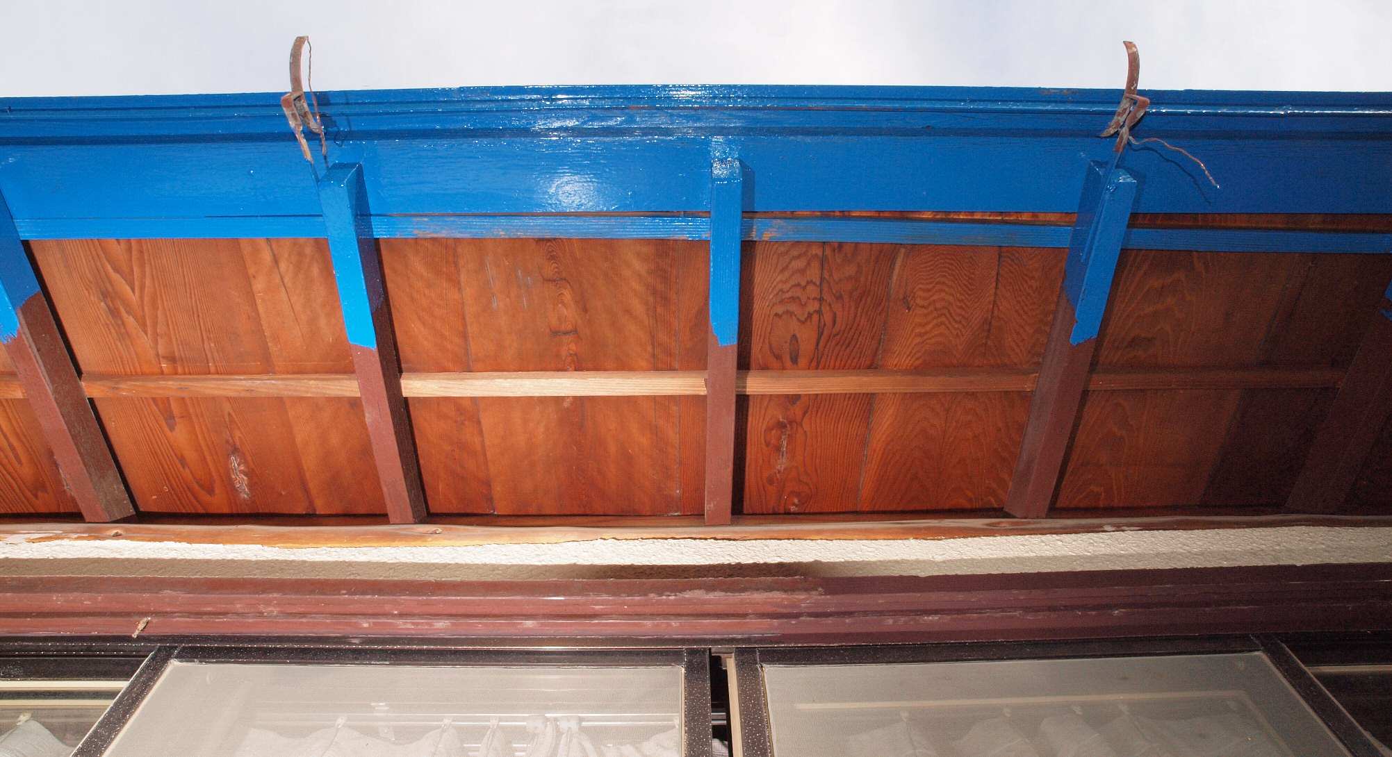 | 41. 修理(清掃後)中 1F南側軒天中央部 下から、拡大。 廣小舞にペイントが無? |