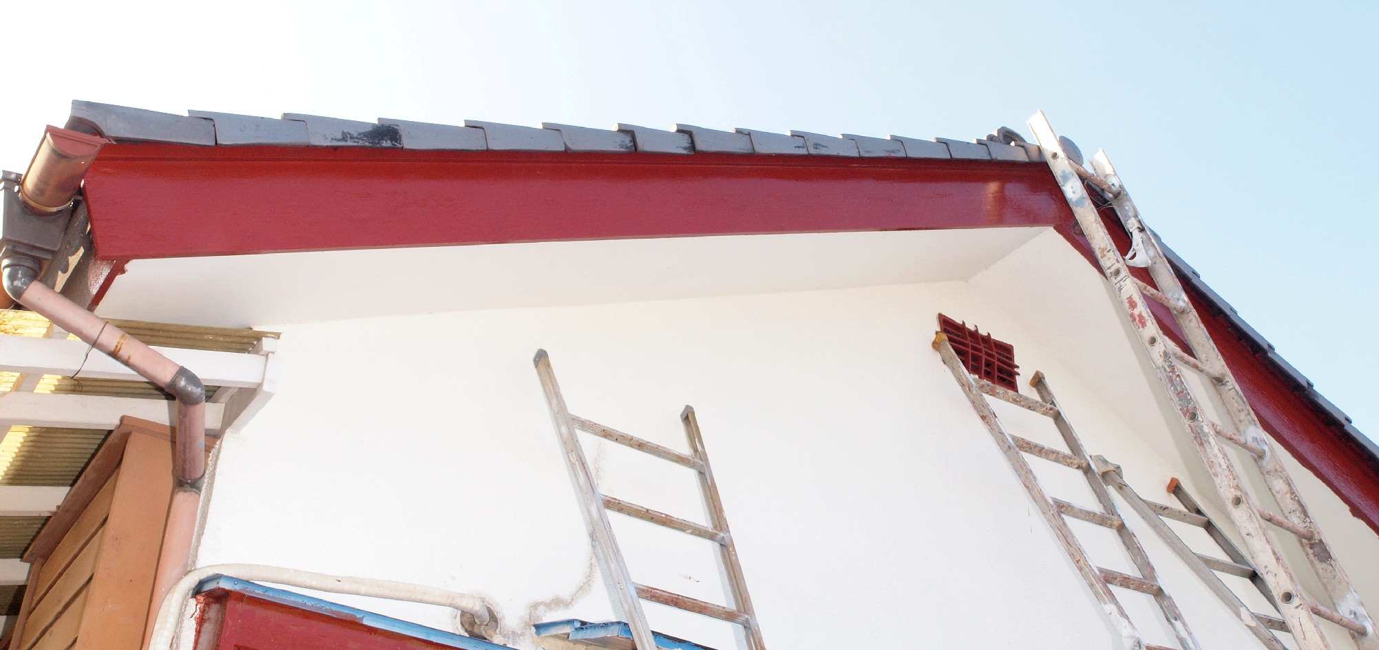 | 4. 平成29年修理中 軒天塗装。 破風下端も塗装する。 |