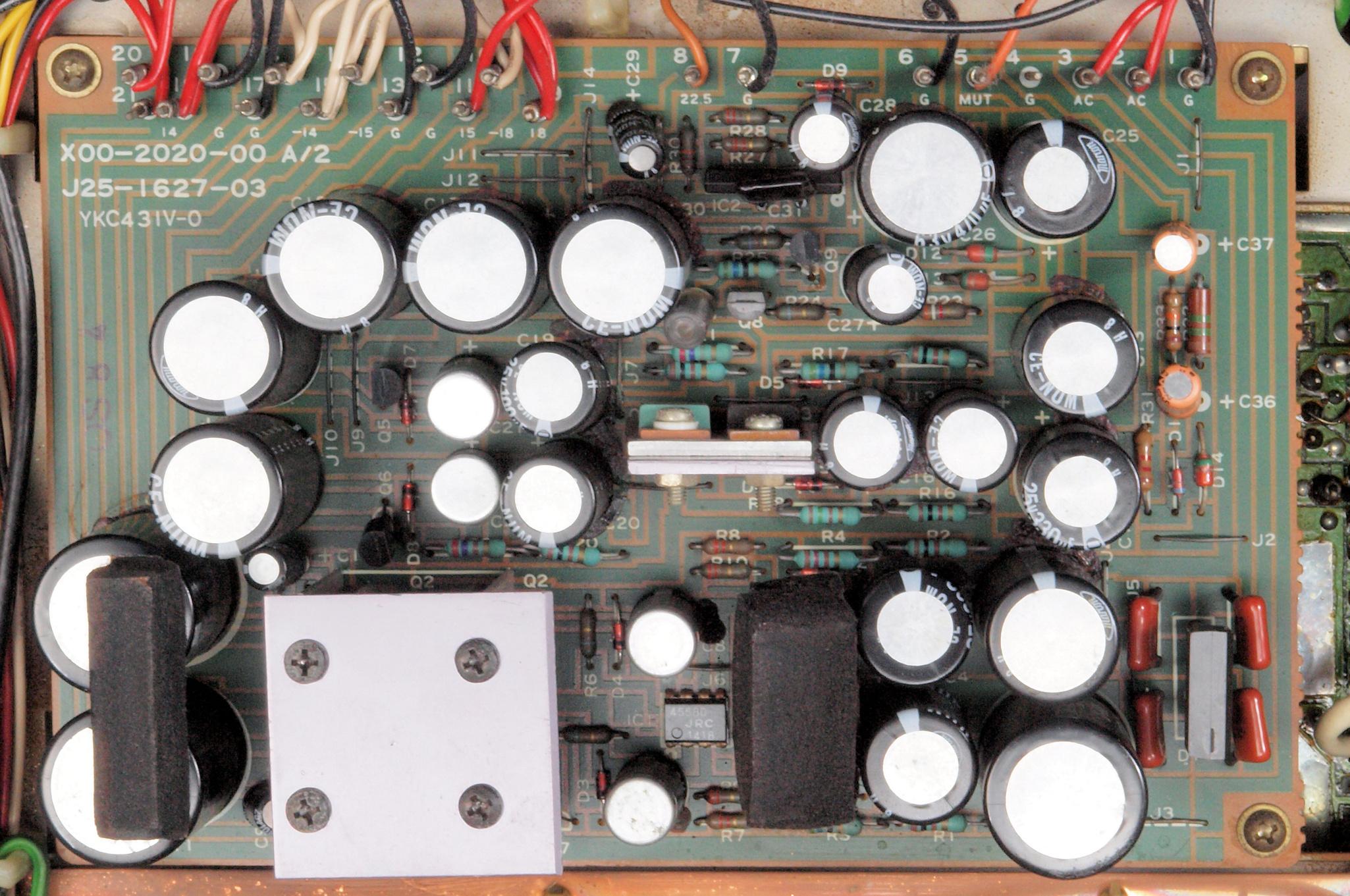| C15. 修理後 PowerSupply基板。 ゼナーダイオード2個、電解コンデンサー32個交換、黒ミューズが大分使用できました。 | ||||||||||||||||||||||||||||||||||||||||||||||||