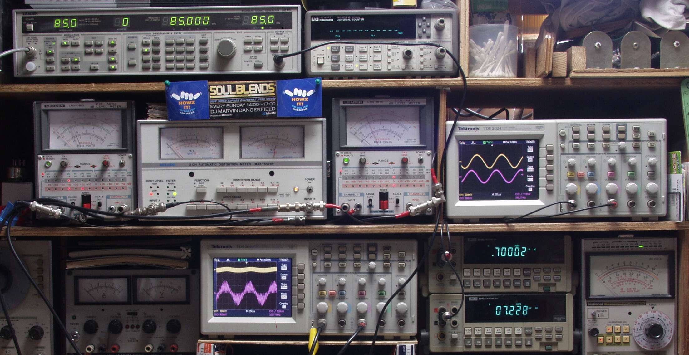 中中左歪み率計=出力の歪み率測定 左メータ=L出力、右メータ=R出力。