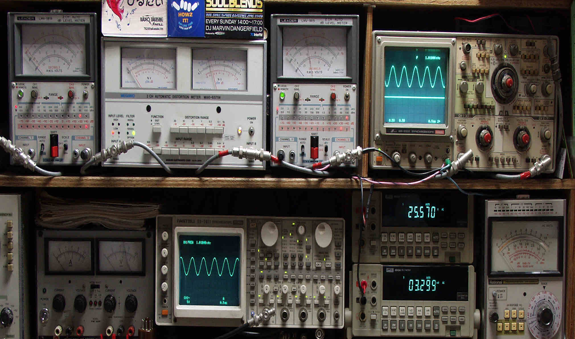 | R1. 測定・調整。 画像をクリックすると、大きく(横幅2050ドット)表示されます。 「見方」。 上段中 右側SP出力を「Audio Analyzer Panasonic VP−7723B」により測定。 表示LED、 左端=メモリーNo、 中左=周波数測定、 中右=出力電圧測定、 右端=歪み率測定。 上段右端 VP−7723Bの基本波除去出力を「owon SDS8202(200MHZ)」で「FFT分析」表示。 下段中 左側SP出力を「Audio Analyzer Panasonic VP−7723B」により測定。 表示LED、 左端=メモリーNo、 中左=周波数測定、 中右=出力電圧測定、 右端=歪み率測定。 下段右端 VP−7723Bの基本波除去出力を「owon SDS6062(200MHZ)」で「FFT分析」表示。 下段左端 オーディオ発振器 VP−7201A より50Hz〜100kHzの信号を出し(歪み率=約0.003%)、ATT+分配器を通し、AMPに入力。 よって、ダイアル設定出力レベルより低くなります。測定機器の仕様や整備の様子はこちら、「VP−7723B」「VP−7201A」。 FFT画面の見方はこちら。 |