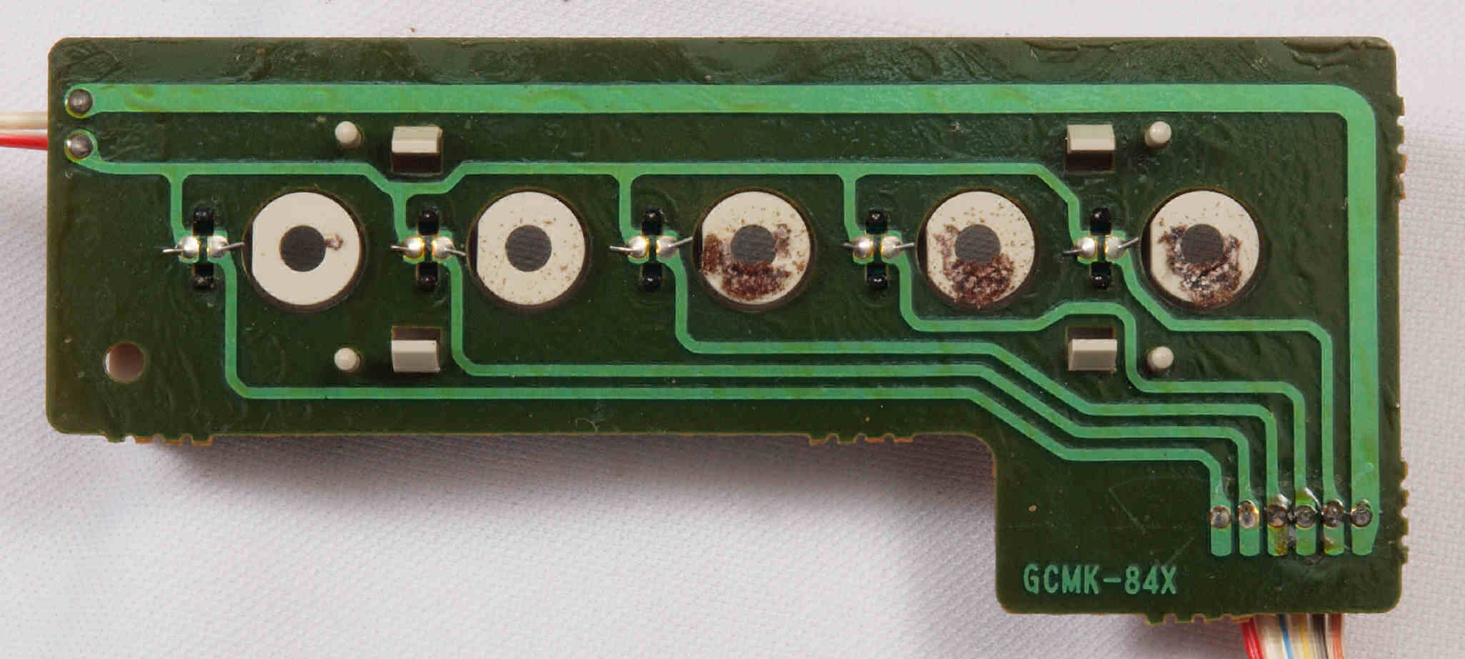 C71. 点検中 入力切り換えSWの表示比較(正面)。 左2個=付いていたマメ球、右2個=交換するLED。