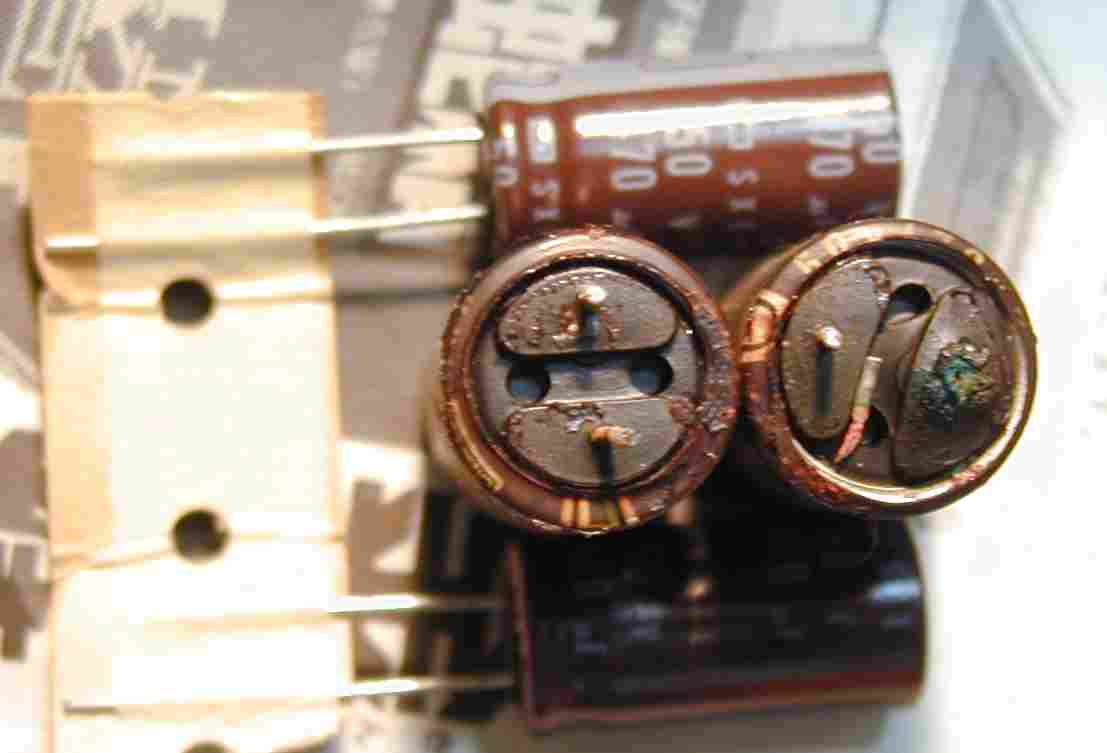 | 5.ドライブ基板の液漏れして足の腐った電解コンデンサー、上下は取り替える新しい電解コンデンサー |