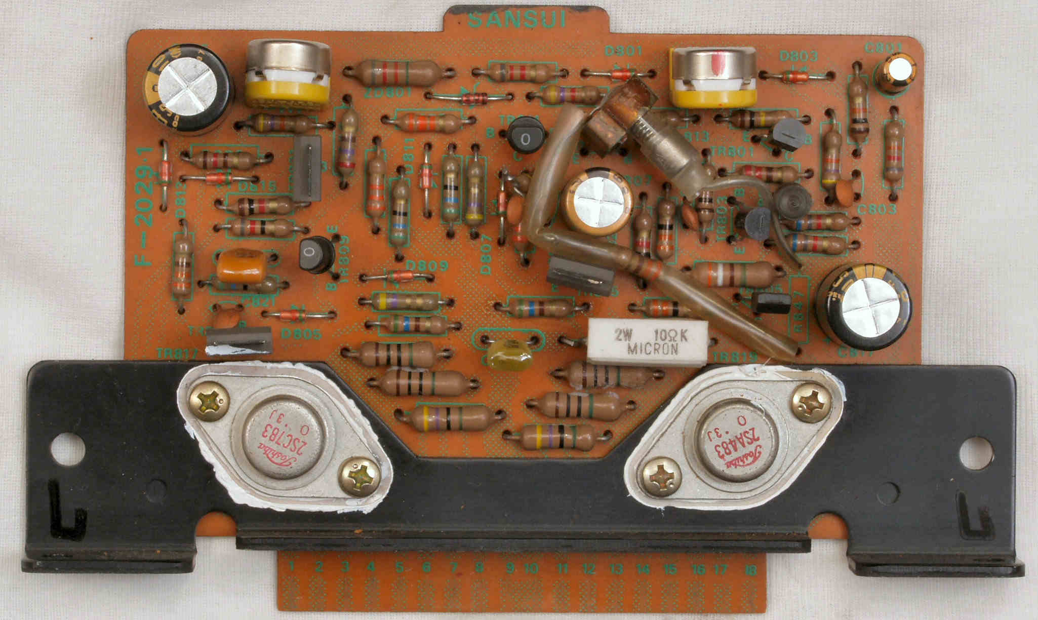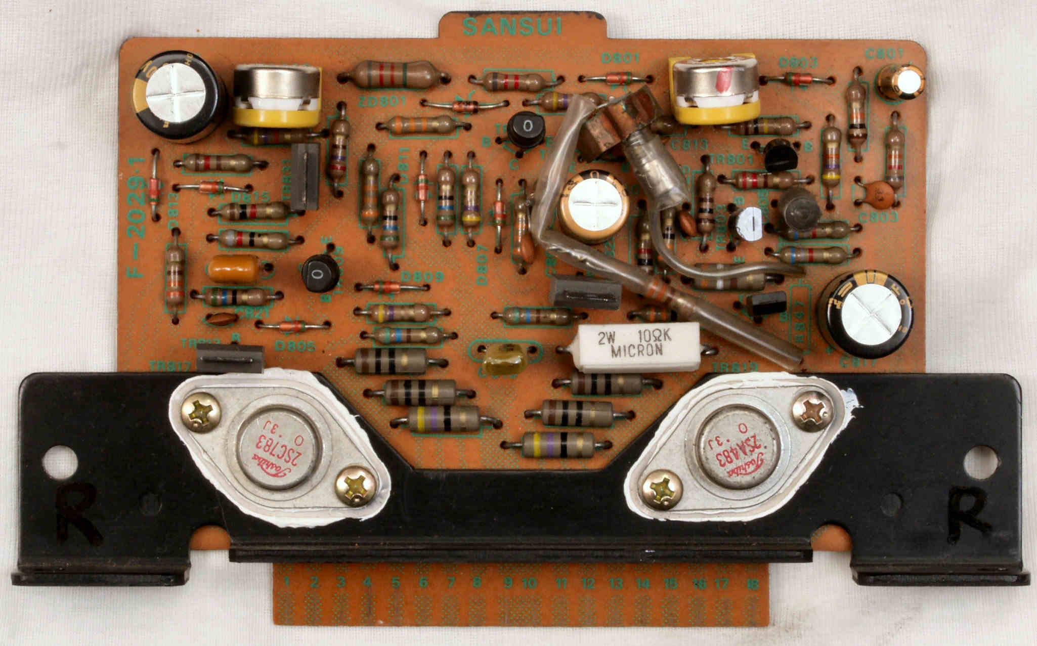 | C21. 修理前 R側終段基板、こちら側のみ初段TR(トランジスター)が2個交換されている。 | ||||||||||||||||||||||||||||||||||||||||||