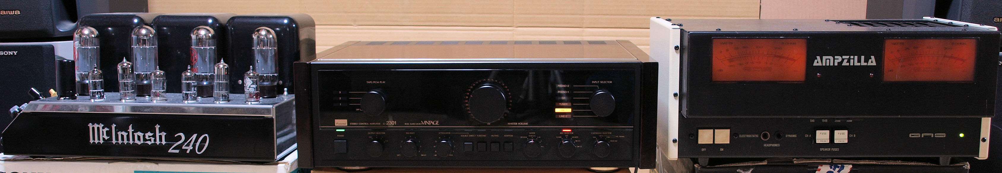 E4. 24時間エージング中、 左= Mcintosh MC240、 右=GAS AMPZILLA 2A. 5台目
