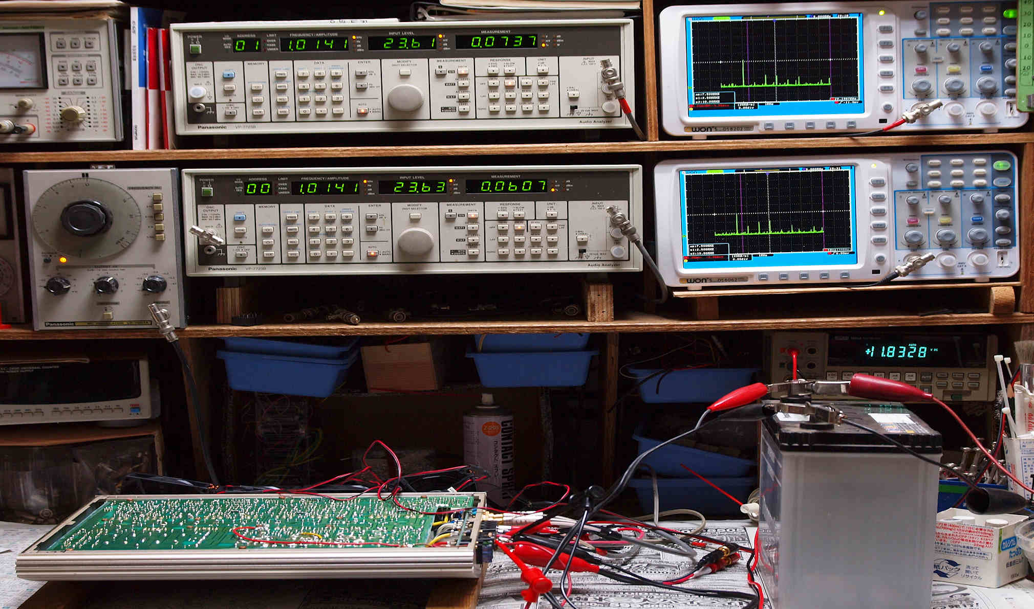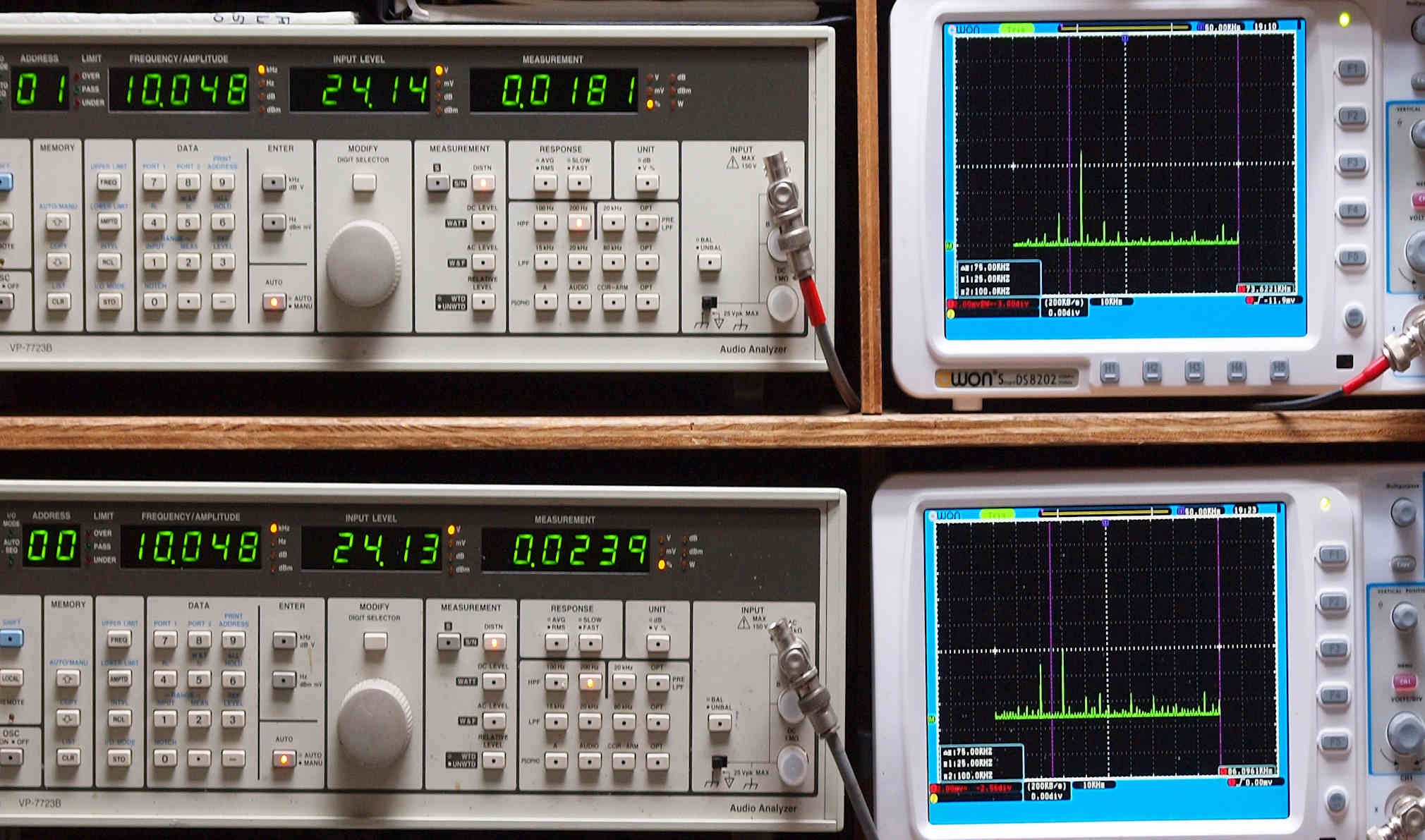 | E. 測定・調整 E1. 出力・歪み率測定・調整 「見方」。 上段中 右側SP出力を「Audio Analyzer Panasonic VP−7723B」により測定。 表示LED、 左端=メモリーNo、 中左=周波数測定、 中右=出力電圧測定、 右端=歪み率測定。 上段右端 VP−7723Bの基本波除去出力を「owon SDS8202(200MHZ)」で「FFT分析」表示。 下段中 左側SP出力を「Audio Analyzer Panasonic VP−7723B」により測定。 表示LED、 左端=メモリーNo、 中左=周波数測定、 中右=出力電圧測定、 右端=歪み率測定。 下段右端 VP−7723Bの基本波除去出力を「owon SDS6062(200MHZ)」で「FFT分析」表示。 下段左端 オーディオ発振器 VP−7201A より50Hz〜100kHzの信号を出し(歪み率=約0.003%)、ATT+分配器を通し、AMPに入力。 よって、ダイアル設定出力レベルより低くなります。測定機器の仕様や整備の様子はこちら、「VP−7723B」「VP−7201A」。 FFT画面の見方はこちら。 |