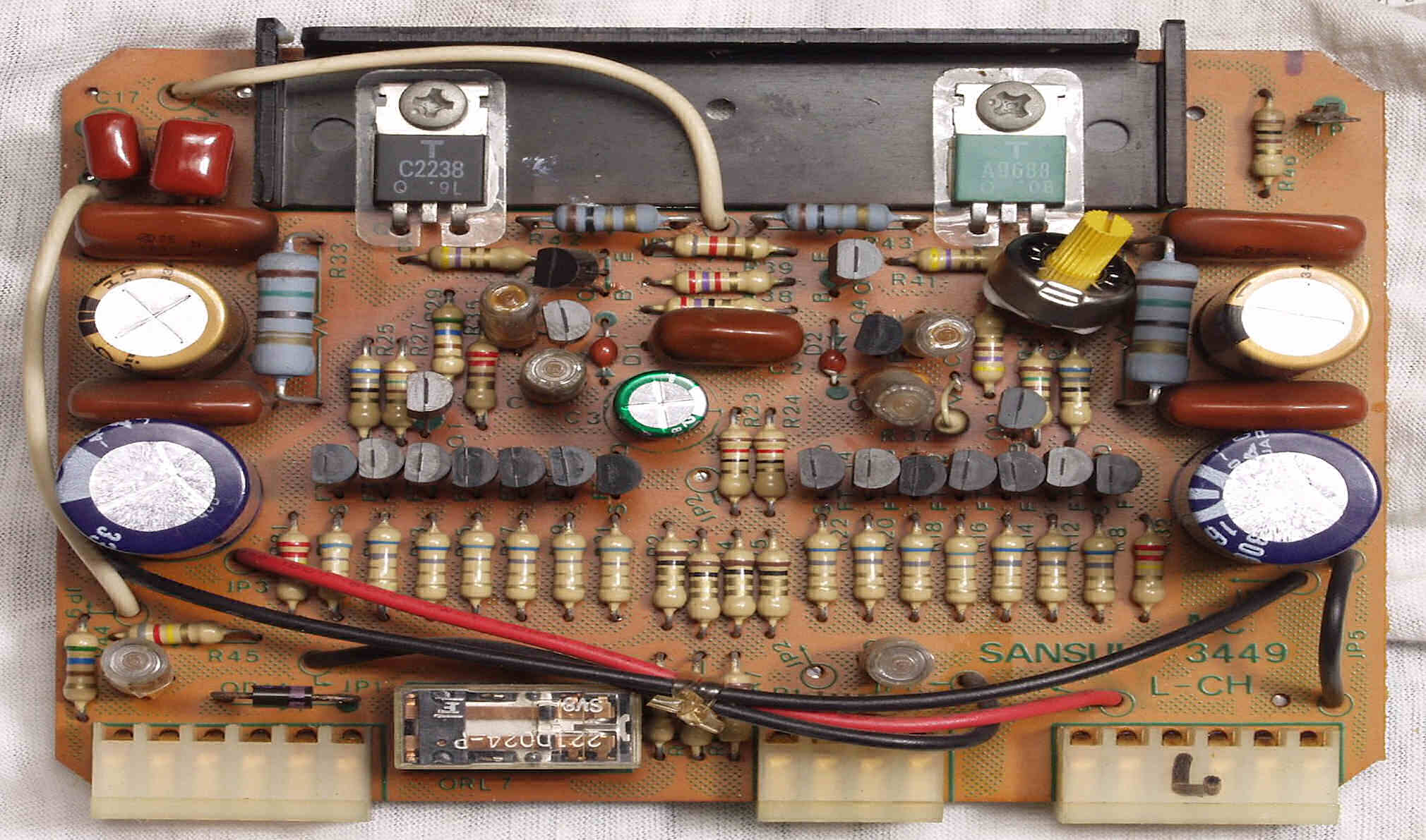 C2B. 修理後 L側終段基板 初段FET(電界効果トランジスター)、半固定VR=2個 電解コンデンサー=11個交換