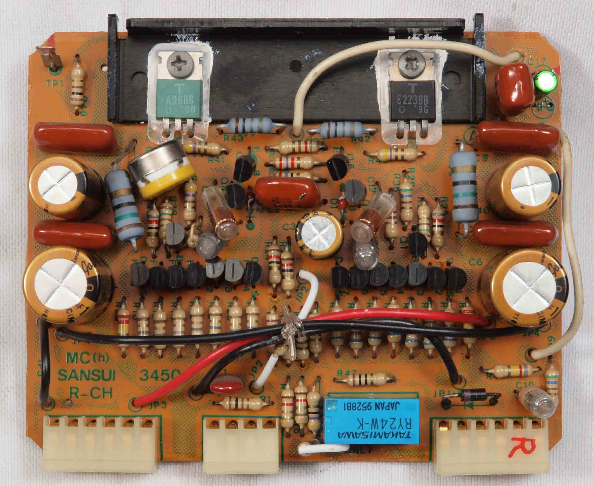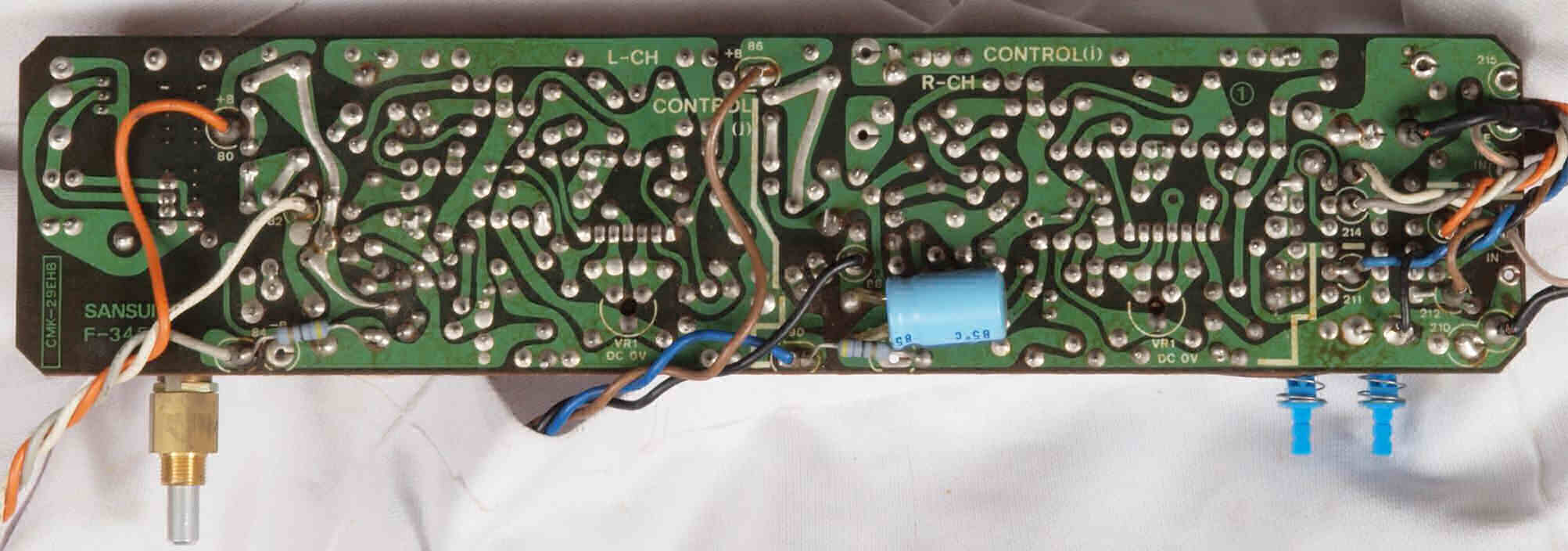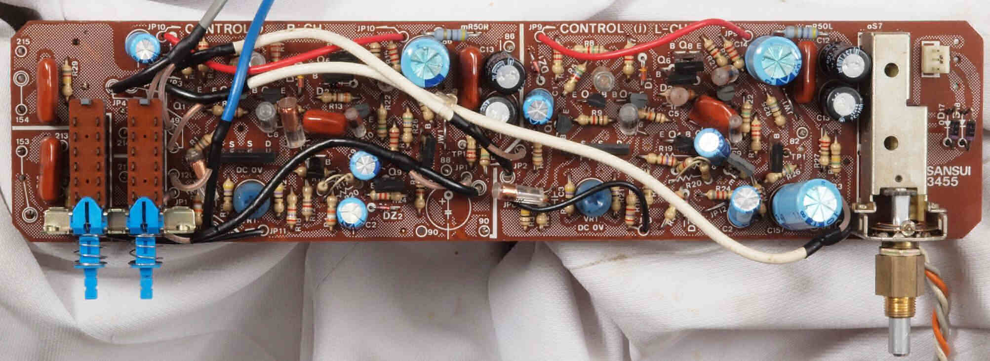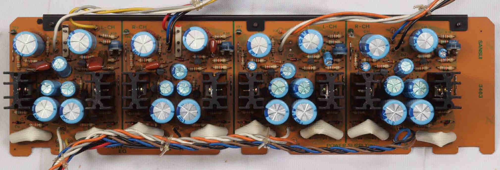 初段FET(電界効果トランジスター)、半固定VR2個、電解コンデンサー11個交換。フイルムコンデンサー2個追加。