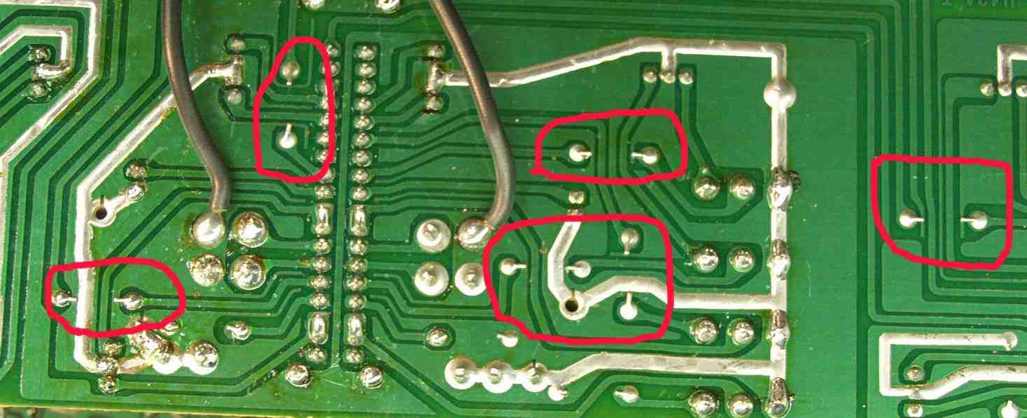 | 3. SW基板のジャンパー線の取り付け不良(赤い中) 作業者への指導が悪く、何でも内側に曲げるだけ、隣のラインに掛かっている |