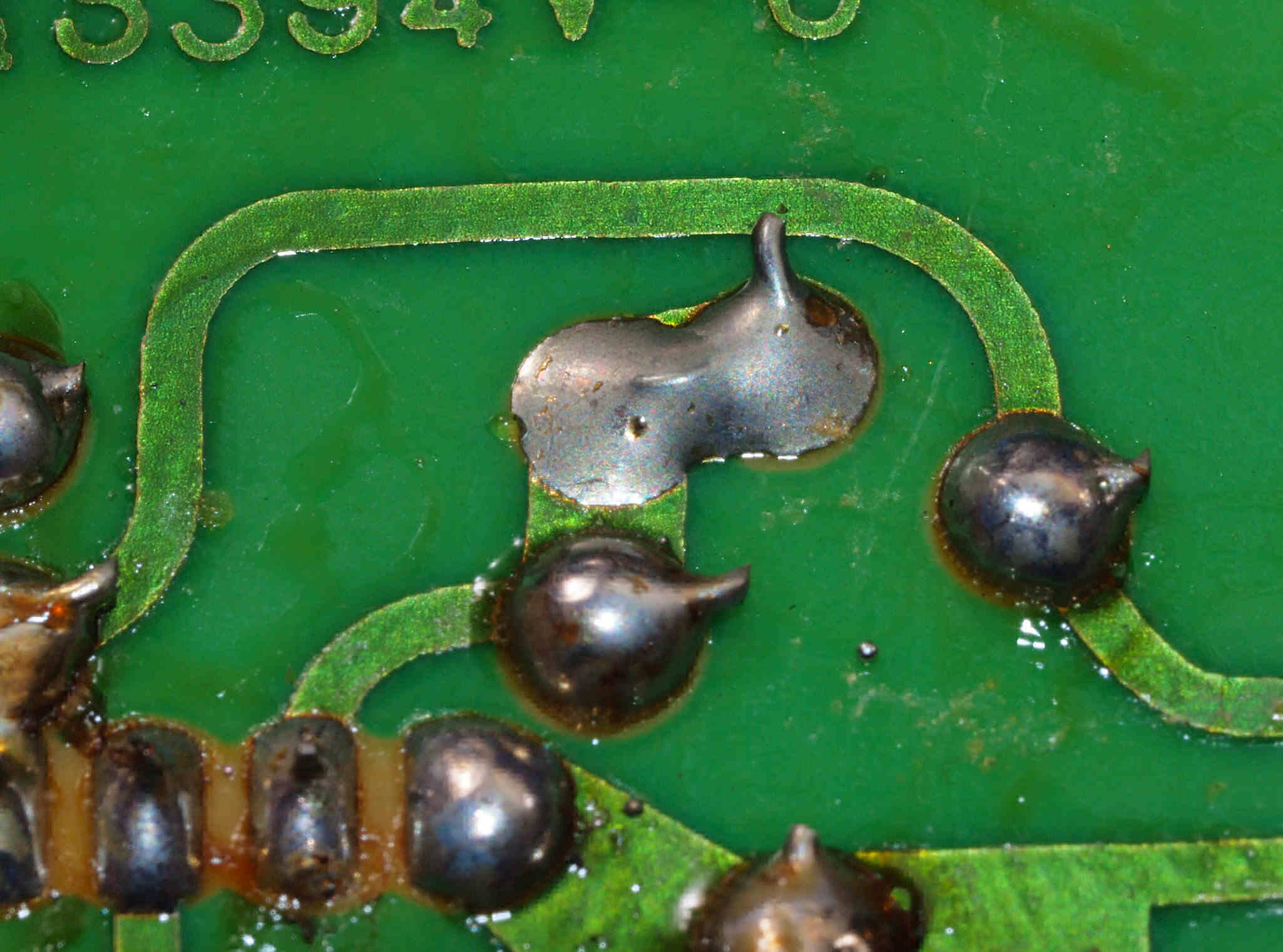 | A83. 点検中 R側EQ_AMP基板裏の半田不良予備郡、拡大2。 | ||||||||||||||||||||||||||||||||||||||||||||||