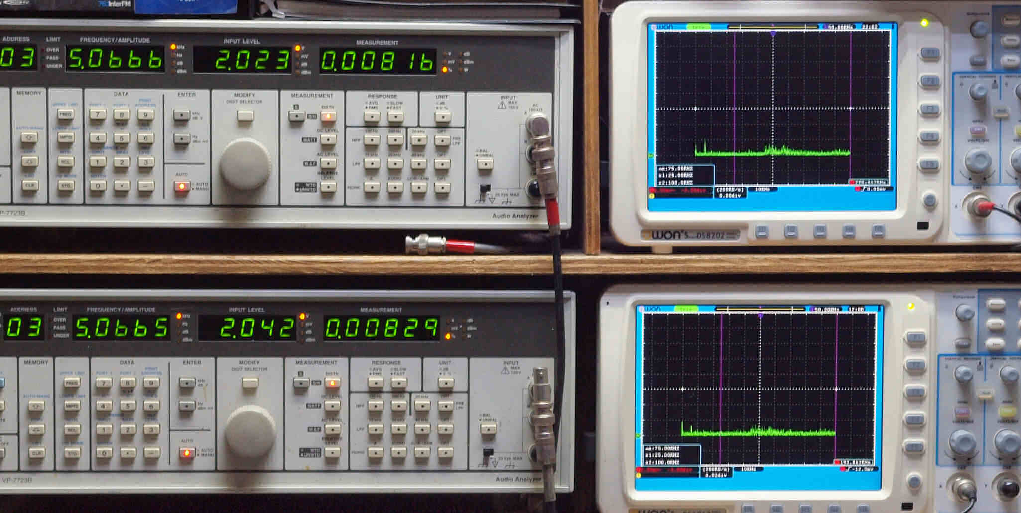 | E25. MM、5kHz入力=R側出力電圧2V、 0.01191%歪み。 L側出力電圧2V、 0.01242%歪み。 「FFT分析」のオシロのカーソル周波数、左=25kHz、右=100kHz。 |