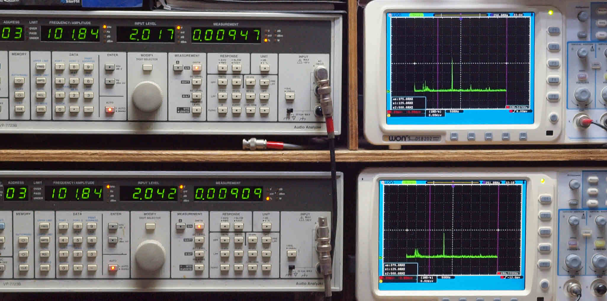 | T. 修理前点検測定 。 画像をクリックすると、大きく(横幅2050ドット)表示されます。 T0. 出力・歪み率測定・調整。 「見方」。 上段中 右側SP出力を「Audio Analyzer Panasonic VP−7723B」により測定。 表示LED、 左端=メモリーNo、 中左=周波数測定、 中右=出力電圧測定、 右端=歪み率測定。 上段右端 VP−7723Bの基本波除去出力を「owon SDS8202(200MHZ)」で「FFT分析」表示。 下段中 左側SP出力を「Audio Analyzer Panasonic VP−7723B」により測定。 表示LED、 左端=メモリーNo、 中左=周波数測定、 中右=出力電圧測定、 右端=歪み率測定。 下段右端 VP−7723Bの基本波除去出力を「owon SDS6062(200MHZ)」で「FFT分析」表示。 下段左端 オーディオ発振器 VP−7201A より50Hz〜100kHzの信号を出し(歪み率=約0.003%)、ATT+分配器を通し、AMPに入力。 よって、ダイアル設定出力レベルより低くなります。測定機器の仕様や整備の様子はこちら、「VP−7723B」「VP−7201A」。 FFT画面の見方はこちら。 |