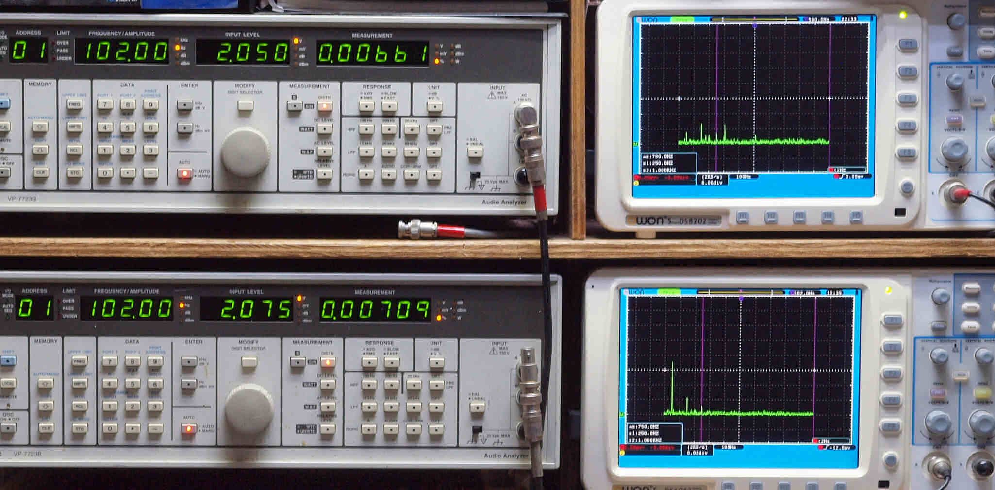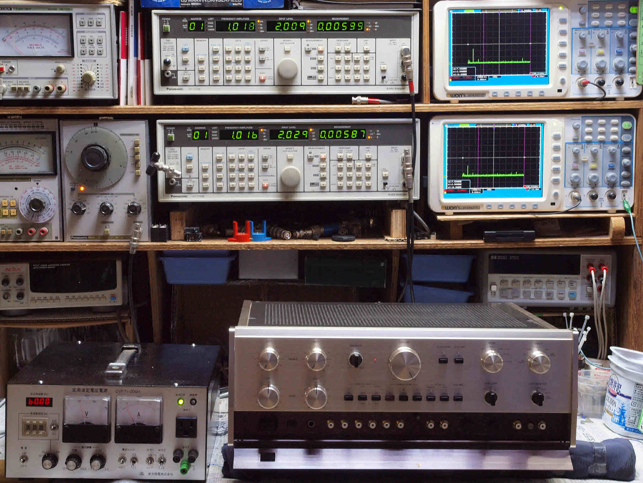 | E. 調整・測定。 画像をクリックすると、大きく(横幅2050ドット)表示されます。 E0. 出力・歪み率測定・調整。AC100V、60HZで測定。 「見方」。 上段中 右側SP出力を「Audio Analyzer Panasonic VP−7723B」により測定。 表示LED、 左端=メモリーNo、 中左=周波数測定、 中右=出力電圧測定、 右端=歪み率測定。 上段右端 VP−7723Bの基本波除去出力を「owon SDS8202(200MHZ)」で「FFT分析」表示。 下段中 左側SP出力を「Audio Analyzer Panasonic VP−7723B」により測定。 表示LED、 左端=メモリーNo、 中左=周波数測定、 中右=出力電圧測定、 右端=歪み率測定。 下段右端 VP−7723Bの基本波除去出力を「owon SDS6062(200MHZ)」で「FFT分析」表示。 下段左端 オーディオ発振器 VP−7201A より50Hz〜100kHzの信号を出し(歪み率=約0.003%)、ATT+分配器を通し、AMPに入力。 よって、ダイアル設定出力レベルより低くなります。測定機器の仕様や整備の様子はこちら、「VP−7723B」「VP−7201A」。 FFT画面の見方はこちら。 左下は定周波数・定電圧交流電源CVFT1-200H. 4台目 |