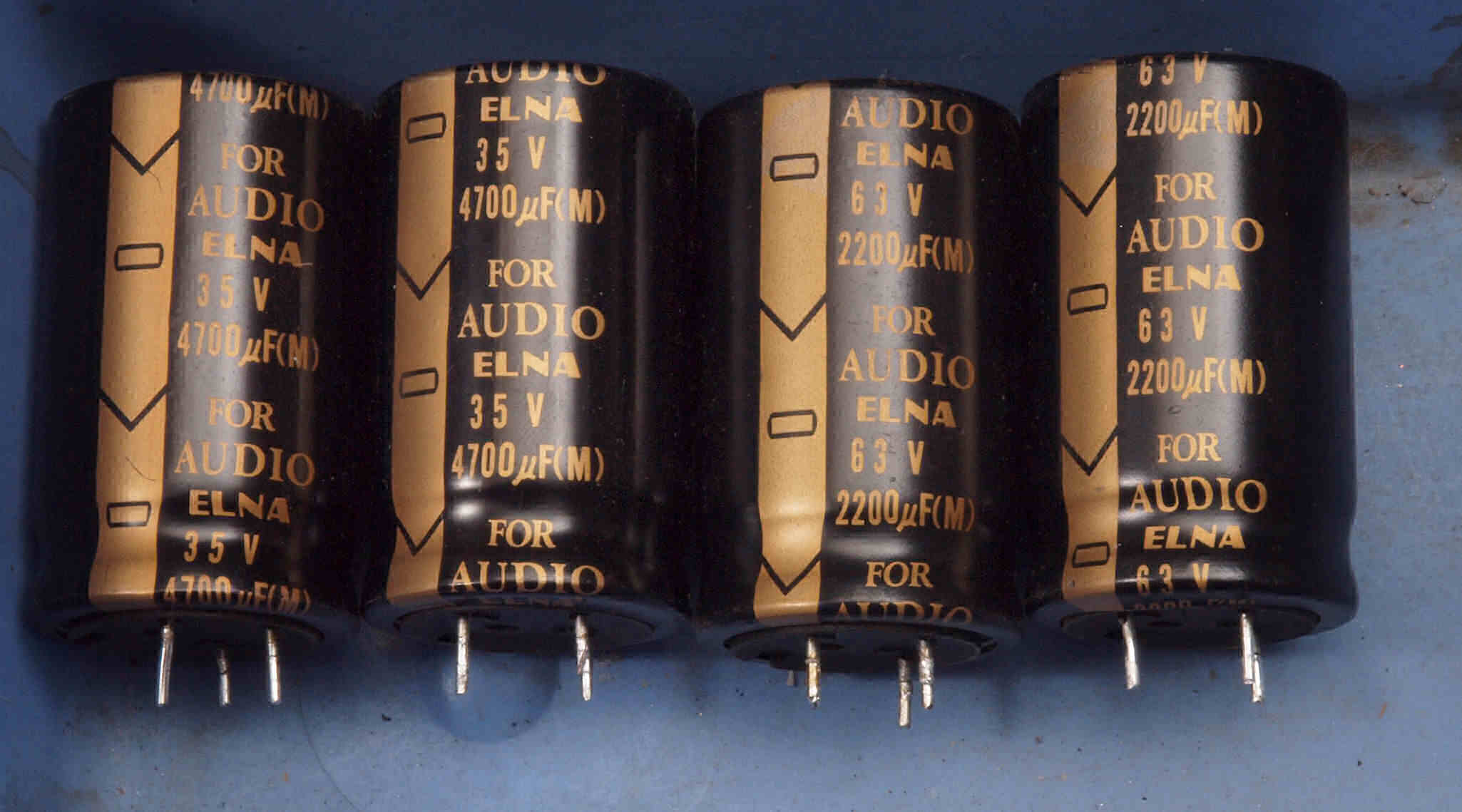 | A51. 点検中 電源ブロック電解コンデンサー比較。 中2個=付いている物 4700μ/35V・2200μ/63V、 左右端=交換する物 10000μ/63V。 |