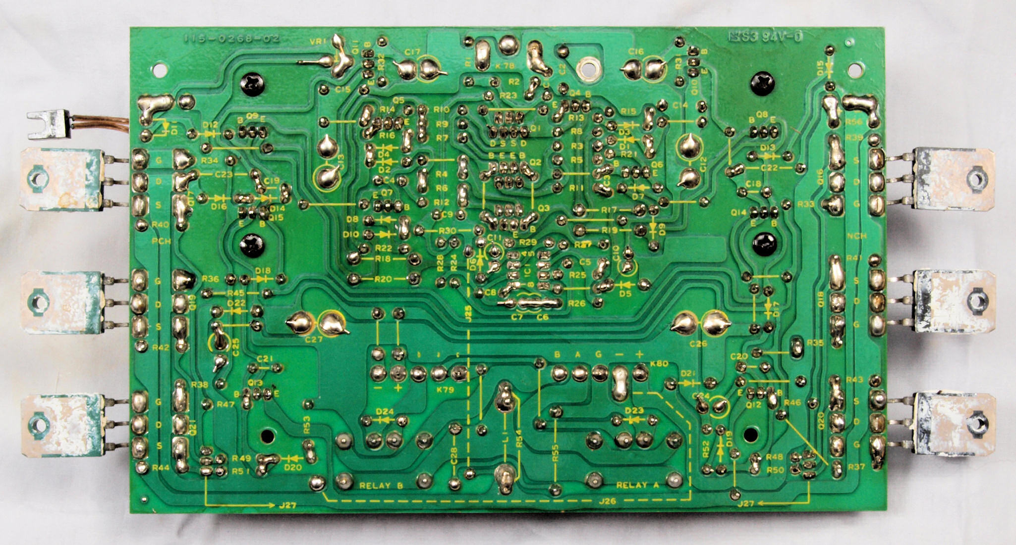 | C12. 修理後 右側終段基板。 電解コンデンサー11個、リレー2個、初段複合FET(電界効果トランジスター)1個、OP−AMP1個、テフロン絶縁シート6枚交換。 | ||||||||||||||||||||||||||||||||||||||||||||||||||||||||||||||||||||||||||||||||||||||