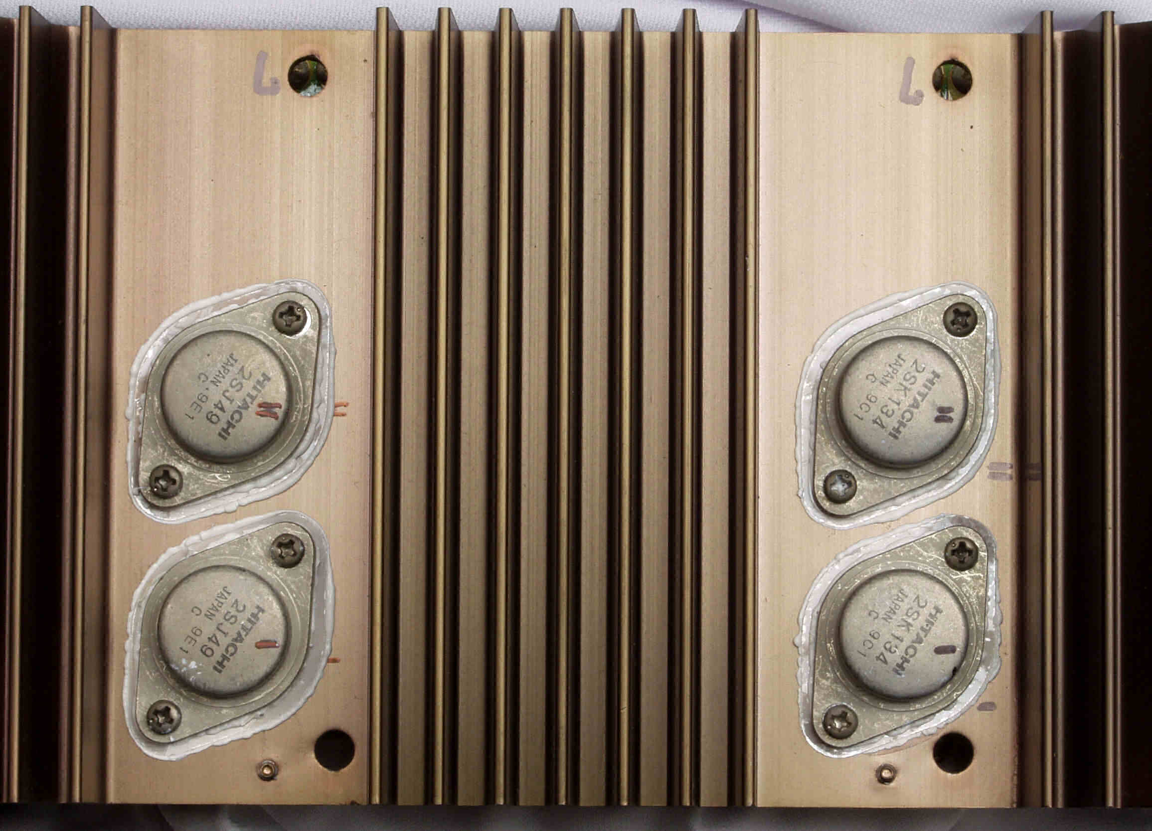 | C112. 修理中 R側終段FET(電解トランジスター)、熱の為、凝固した穂熱シリコン。 | ||||||||||||||||||||||||||
