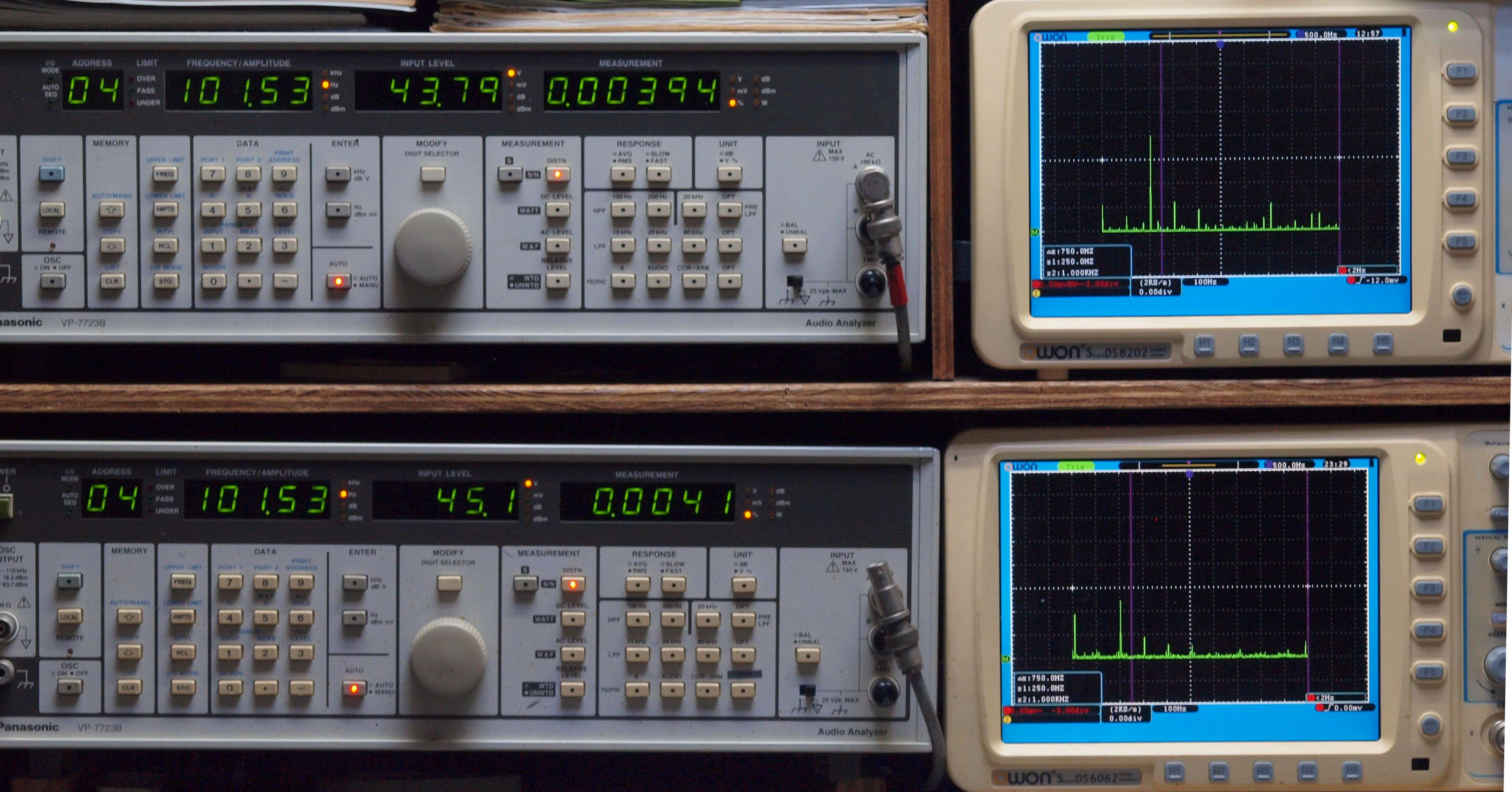 | E. 測定・調整。 画像をクリックすると、大きく(横幅2050ドット)表示されます。 E0. 出力・歪み率測定・調整。(株)高砂製作所 ARH1000 定電圧装置を使用して測定。 「見方」。 上段中 右側SP出力を「Audio Analyzer Panasonic VP−7723B」により測定。 表示LED、 左端=メモリーNo、 中左=周波数測定、 中右=出力電圧測定、 右端=歪み率測定。 上段右端 VP−7723Bの基本波除去出力を「owon SDS8202(200MHZ)」で「FFT分析」表示。 下段中 左側SP出力を「Audio Analyzer Panasonic VP−7723B」により測定。 表示LED、 左端=メモリーNo、 中左=周波数測定、 中右=出力電圧測定、 右端=歪み率測定。 下段右端 VP−7723Bの基本波除去出力を「owon SDS6062(200MHZ)」で「FFT分析」表示。 下段左端 オーディオ発振器 VP−7201A より50Hz〜100kHzの信号を出し(歪み率=約0.003%)、ATT+分配器を通し、AMPに入力。 よって、ダイアル設定出力レベルより低くなります。測定機器の仕様や整備の様子はこちら、「VP−7723B」「VP−7201A」。 FFT画面の見方はこちら。 |