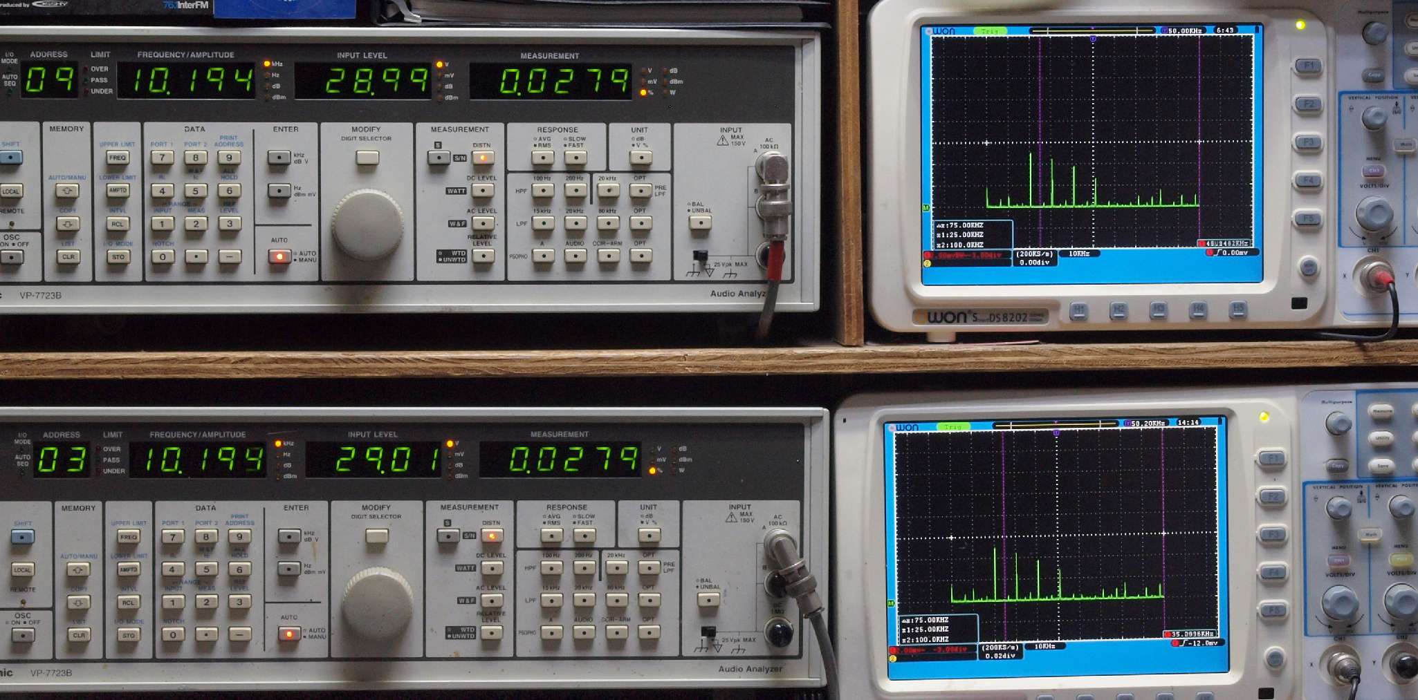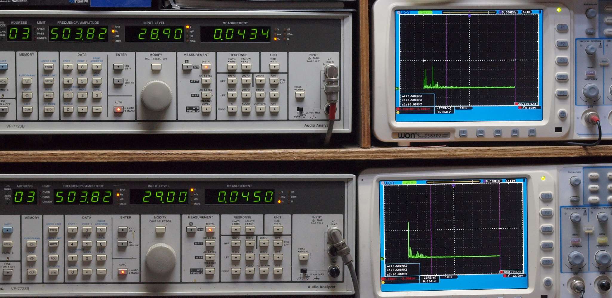よって、ダイアル設定出力レベルより低くなります。測定機器の仕様や整備の様子はこちら、「VP−7723B」「VP−7201A」。 FFT画面の見方はこちら。