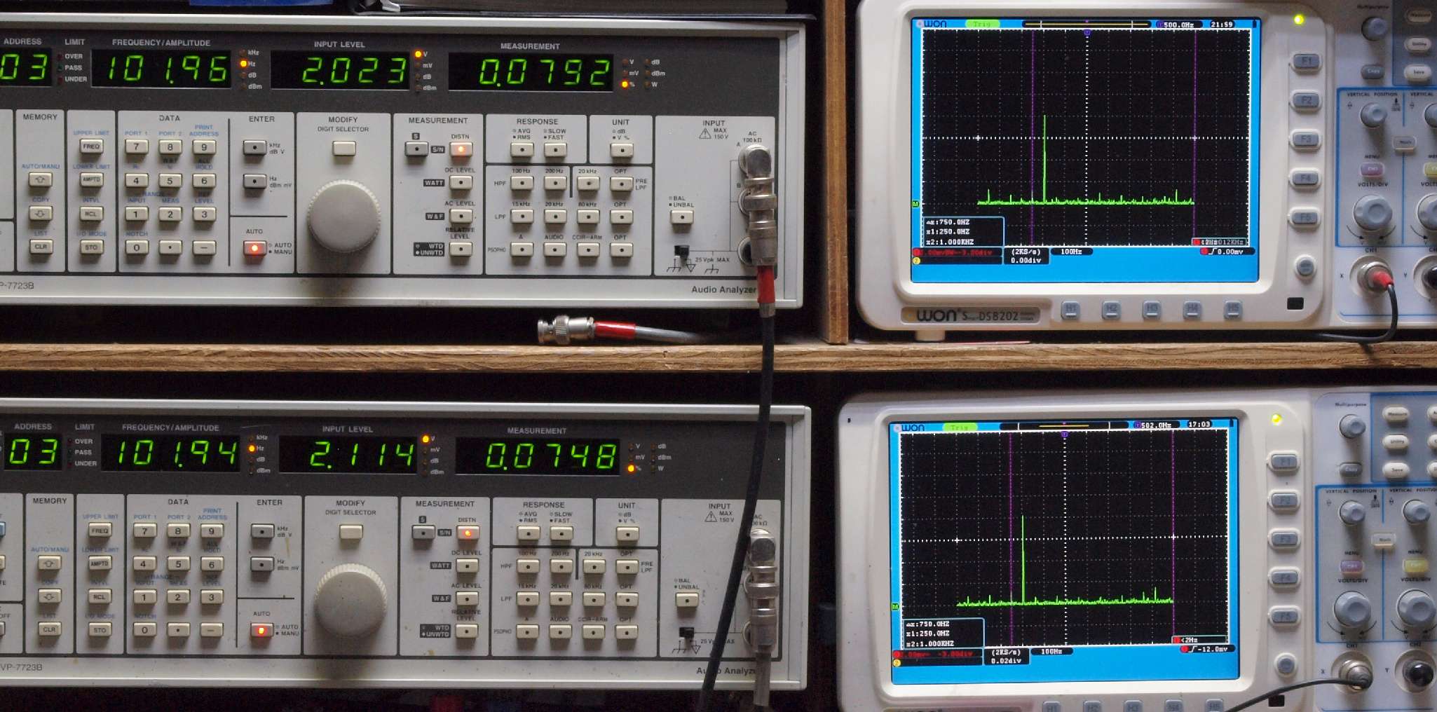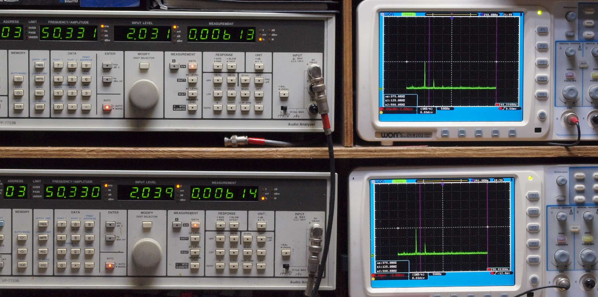 | E. 調整・測定。 画像をクリックすると、大きく(横幅2050ドット)表示されます。 E0. 出力・歪み率測定・調整。 「見方」。 上段中 右側SP出力を「Audio Analyzer Panasonic VP−7723B」により測定。 表示LED、 左端=メモリーNo、 中左=周波数測定、 中右=出力電圧測定、 右端=歪み率測定。 上段右端 VP−7723Bの基本波除去出力を「owon SDS8202(200MHZ)」で「FFT分析」表示。 下段中 左側SP出力を「Audio Analyzer Panasonic VP−7723B」により測定。 表示LED、 左端=メモリーNo、 中左=周波数測定、 中右=出力電圧測定、 右端=歪み率測定。 下段右端 VP−7723Bの基本波除去出力を「owon SDS6062(200MHZ)」で「FFT分析」表示。 下段左端 オーディオ発振器 VP−7201A より50Hz〜100kHzの信号を出し(歪み率=約0.003%)、ATT+分配器を通し、AMPに入力。 よって、ダイアル設定出力レベルより低くなります。測定機器の仕様や整備の様子はこちら、「VP−7723B」「VP−7201A」。 FFT画面の見方はこちら。 |