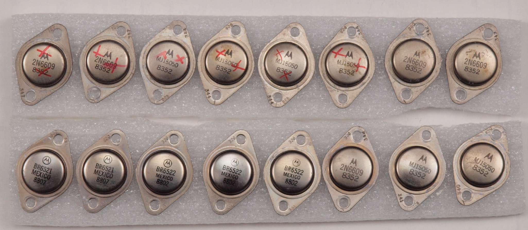 | C41. 修理前 R側終段TR(トランジスター)。 OEMの「MB6521、MB6522」、 モトローラーの汎用品の「2N6609」、ONSEMの「MJ15050の混在。 |