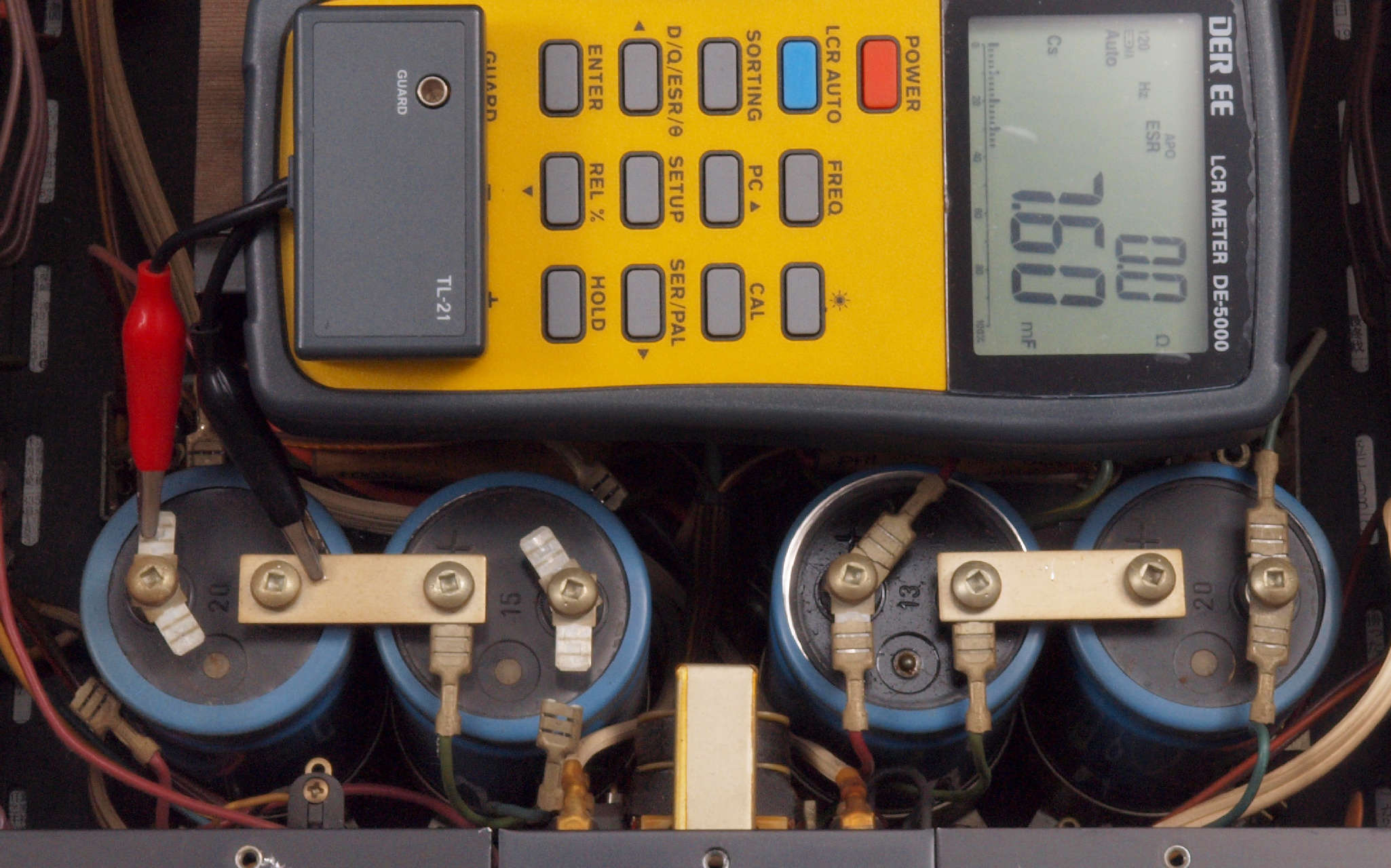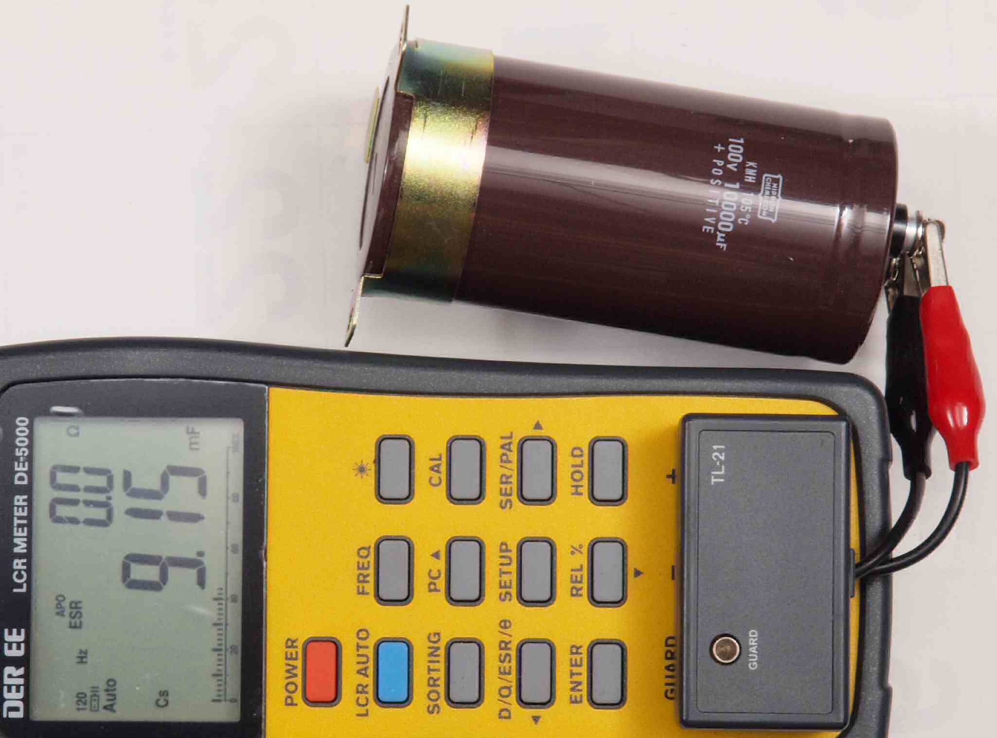 | A42. 点検中 R側+電源ブロック電解コンデンサー測定=7600μF、ESR=0.0Ω。 ESRに付いてはmuRata、Nichicon、ルビコン、Panasonic、日本ケミコン(株)参照。 この測定でNGな物はダメですが、負荷試験方が正確です。 |