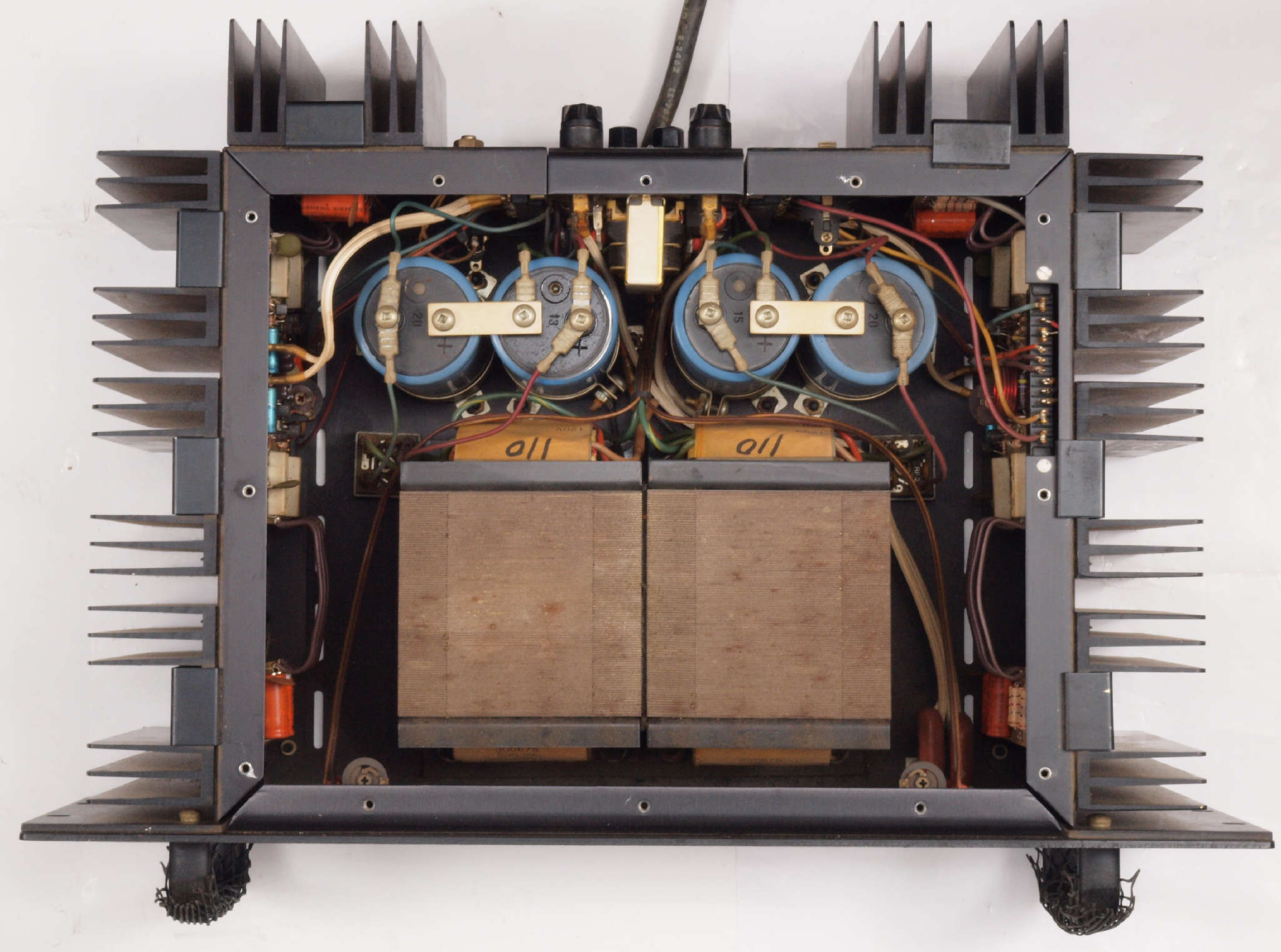 | A51. 点検中 R側終段TR(トランジスター)。 OEMの「MB6521、MB6522」、 モトローラーの汎用品の「2N6609」、ONSEMの「MJ15050」の混在。 |