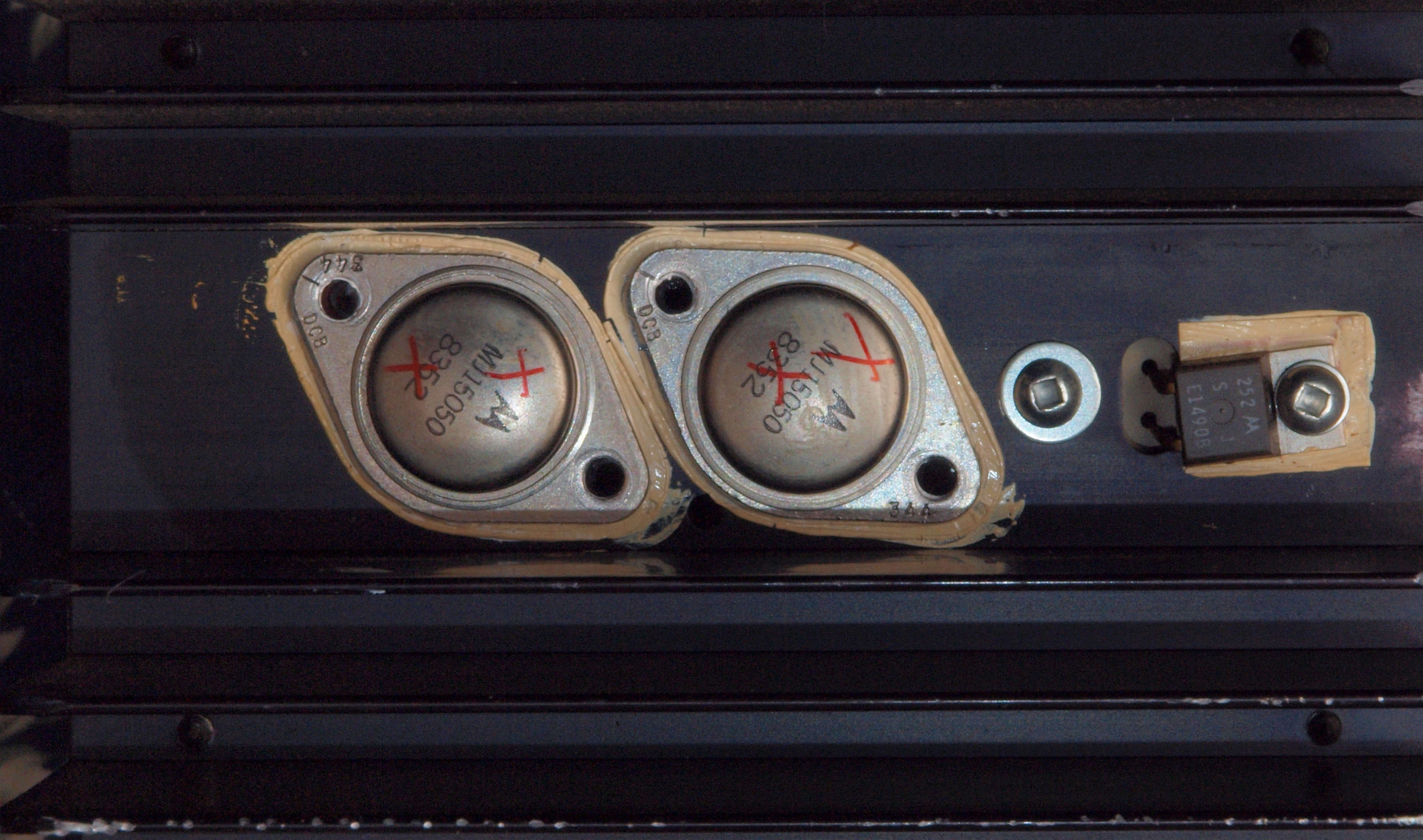 | A56. 点検中 焼損したL側終段TR(トランジスター)その2=赤×印。 | ||||||||||||||||||||||||