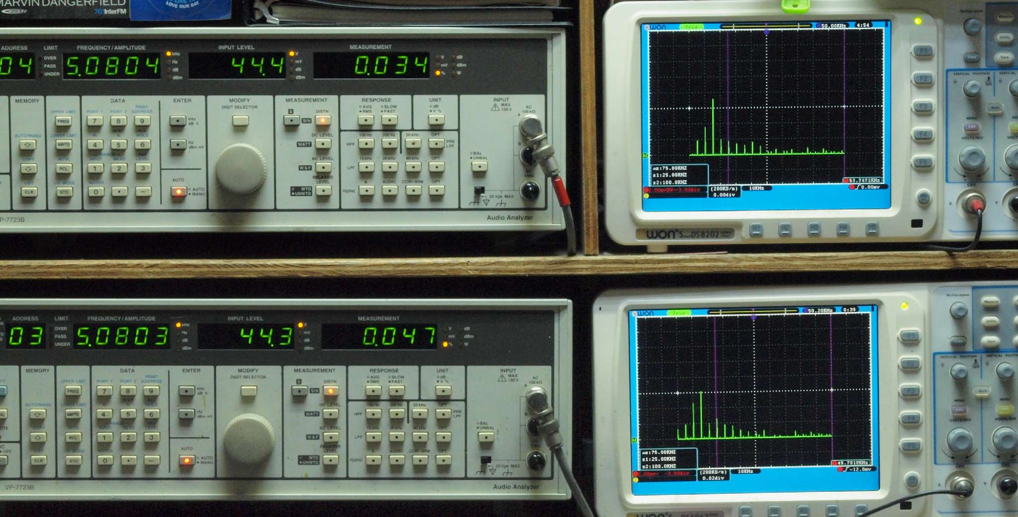 | E. 測定・調整。 画像をクリックすると、大きく(横幅2050ドット)表示されます。 E0. 出力・歪み率測定・調整 「見方」。 上段中 右側SP出力を「Audio Analyzer Panasonic VP−7723B」により測定。 表示LED、 左端=メモリーNo、 中左=周波数測定、 中右=出力電圧測定、 右端=歪み率測定。 上段右端 VP−7723Bの基本波除去出力を「owon SDS8202(200MHZ)」で「FFT分析」表示。 下段中 左側SP出力を「Audio Analyzer Panasonic VP−7723B」により測定。 表示LED、 左端=メモリーNo、 中左=周波数測定、 中右=出力電圧測定、 右端=歪み率測定。 下段右端 VP−7723Bの基本波除去出力を「owon SDS6062(200MHZ)」で「FFT分析」表示。 下段左端 オーディオ発振器 VP−7201A より50Hz〜100kHzの信号を出し(歪み率=約0.003%)、ATT+分配器を通し、AMPに入力。 よって、ダイアル設定出力レベルより低くなります。測定機器の仕様や整備の様子はこちら、「VP−7723B」「VP−7201A」。 FFT画面の見方はこちら。 |
