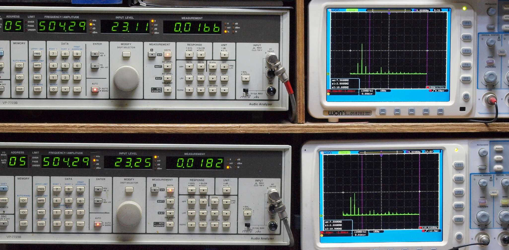 | E. 測定・調整。 画像をクリックすると、大きく(横幅2050ドット)表示されます。 E0. 出力・歪み率測定・調整。 電源はAC100Vで測定。 「見方」。 上段中 右側SP出力を「Audio Analyzer Panasonic VP−7723B」により測定。 表示LED、 左端=メモリーNo、 中左=周波数測定、 中右=出力電圧測定、 右端=歪み率測定。 上段右端 VP−7723Bの基本波除去出力を「owon SDS8202(200MHZ)」で「FFT分析」表示。 下段中 左側SP出力を「Audio Analyzer Panasonic VP−7723B」により測定。 表示LED、 左端=メモリーNo、 中左=周波数測定、 中右=出力電圧測定、 右端=歪み率測定。 下段右端 VP−7723Bの基本波除去出力を「owon SDS6062(200MHZ)」で「FFT分析」表示。 下段左端 オーディオ発振器 VP−7201A より50Hz〜100kHzの信号を出し(歪み率=約0.003%)、ATT+分配器を通し、AMPに入力。 よって、ダイアル設定出力レベルより低くなります。測定機器の仕様や整備の様子はこちら、「VP−7723B」「VP−7201A」。 FFT画面の見方はこちら。 |