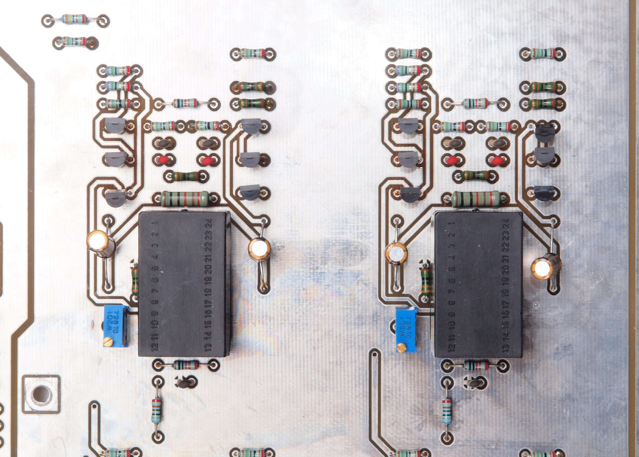 | C21. 修理前 入力アンプ前段基板。 黒い長方形の物2個がモジュール。 | ||||||||||||||||||||||||||||||||||||