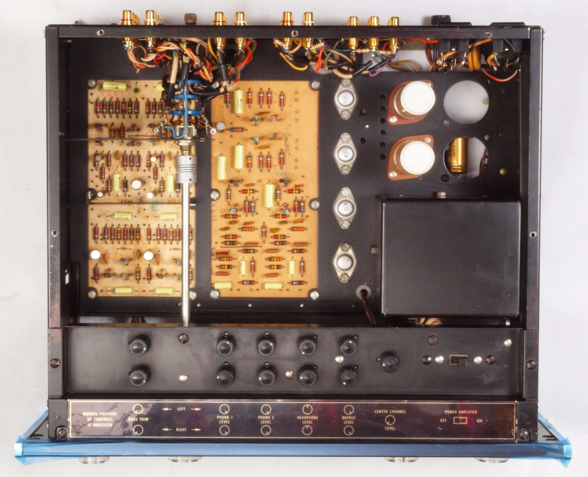 | A33. 点検中 入出力RCA端子郡。 センター出力もテフロン絶縁型と同型で交換可能。 | ||||||||||||||||||||||||||||||||||||||||||||||||||||||||||
