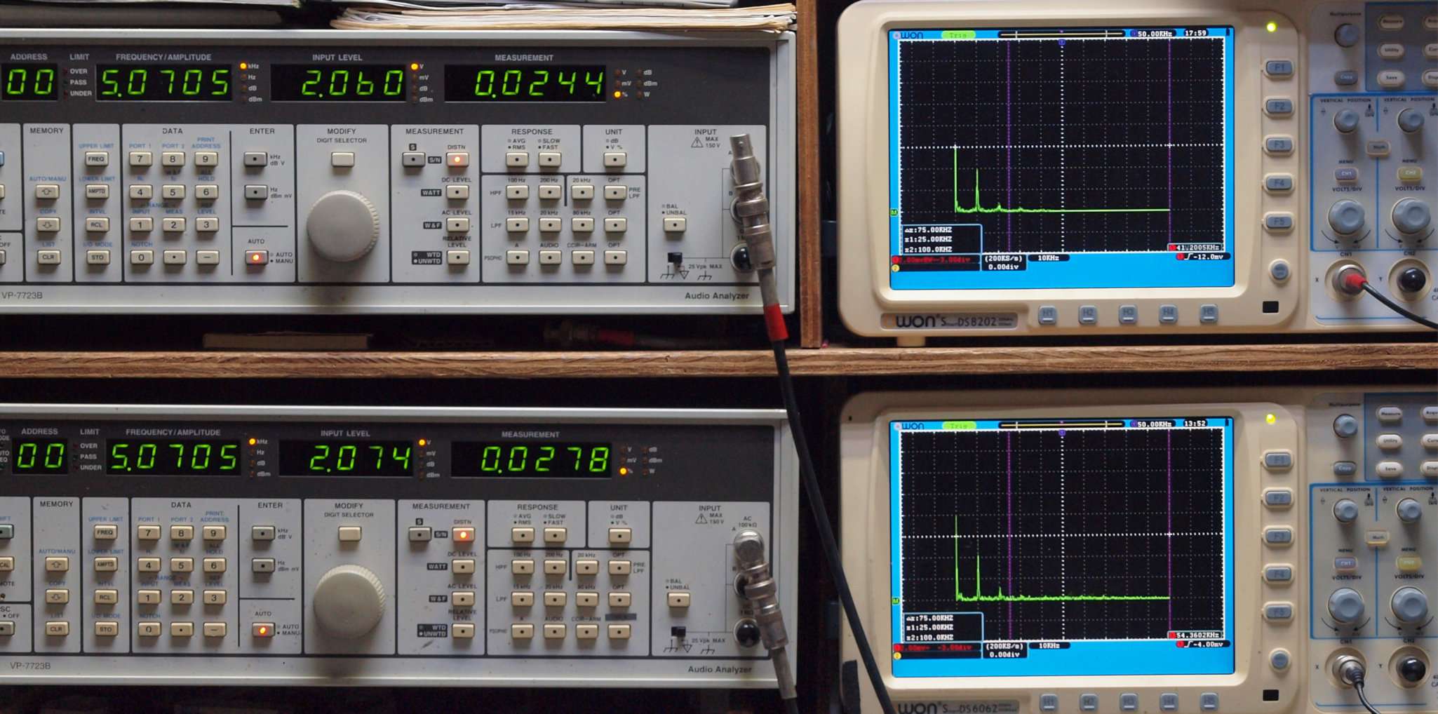 | E. 調整・測定。 画像をクリックすると、大きく(横幅2050ドット)表示されます。 E0. 出力・歪み率測定・調整。 「見方」。 上段中 右側出力を「Audio Analyzer Panasonic VP−7723B」により測定。 表示LED、 左端=メモリーNo、 中左=周波数測定、 中右=出力電圧測定、 右端=歪み率測定。 上段右端 VP−7723Bの基本波除去出力を「owon SDS8202(200MHZ)」で「FFT分析」表示。 下段中 左側出力を「Audio Analyzer Panasonic VP−7723B」により測定。 表示LED、 左端=メモリーNo、 中左=周波数測定、 中右=出力電圧測定、 右端=歪み率測定。 下段右端 VP−7723Bの基本波除去出力を「owon SDS6062(200MHZ)」で「FFT分析」表示。 下段左端 オーディオ発振器 VP−7201A より50Hz〜100kHzの信号を出し(歪み率=約0.003%)、ATT+分配器を通し、AMPに入力。 よって、ダイアル設定出力レベルより低くなります。測定機器の仕様や整備の様子はこちら、「VP−7723B」「VP−7201A」。 FFT画面の見方はこちら。 |
