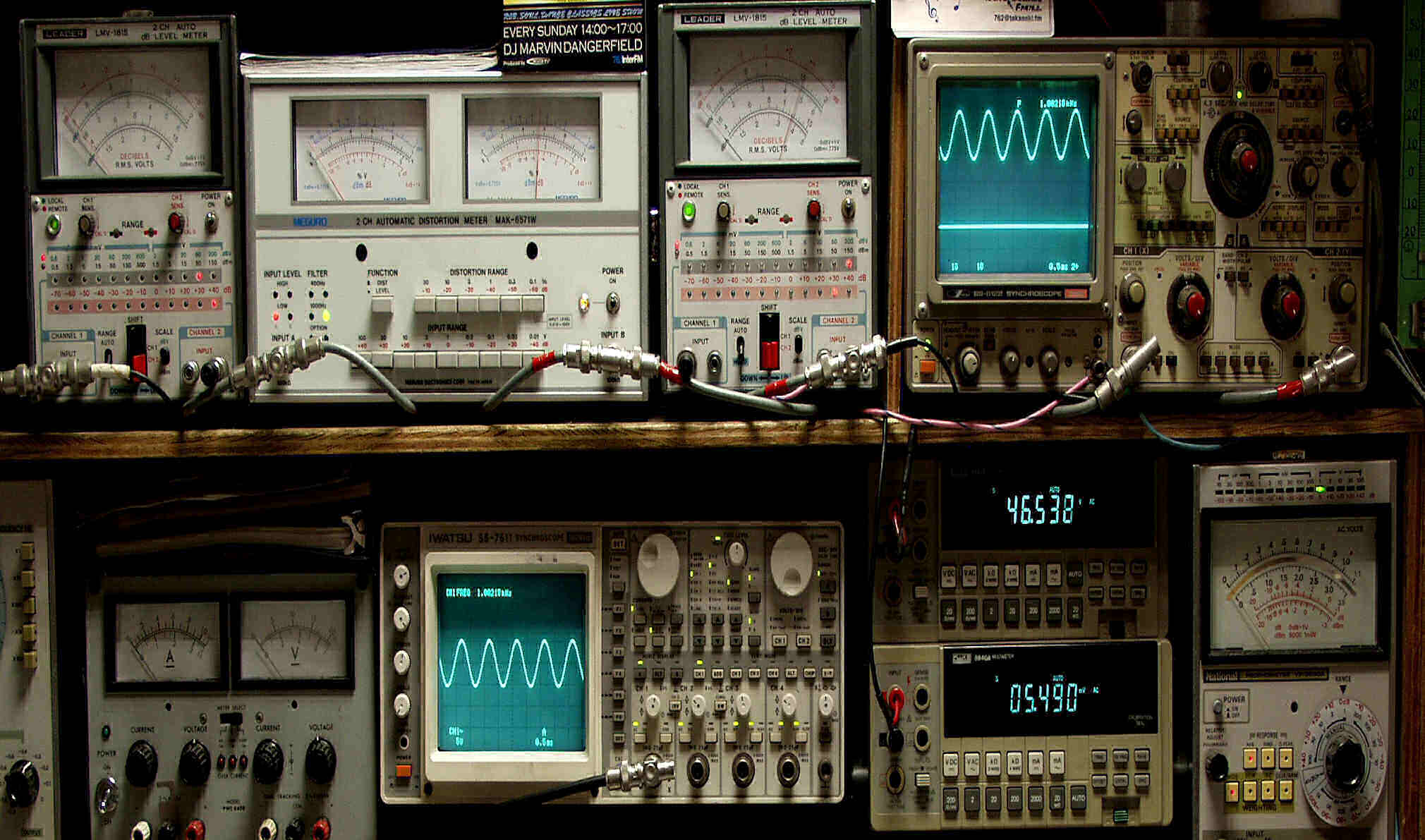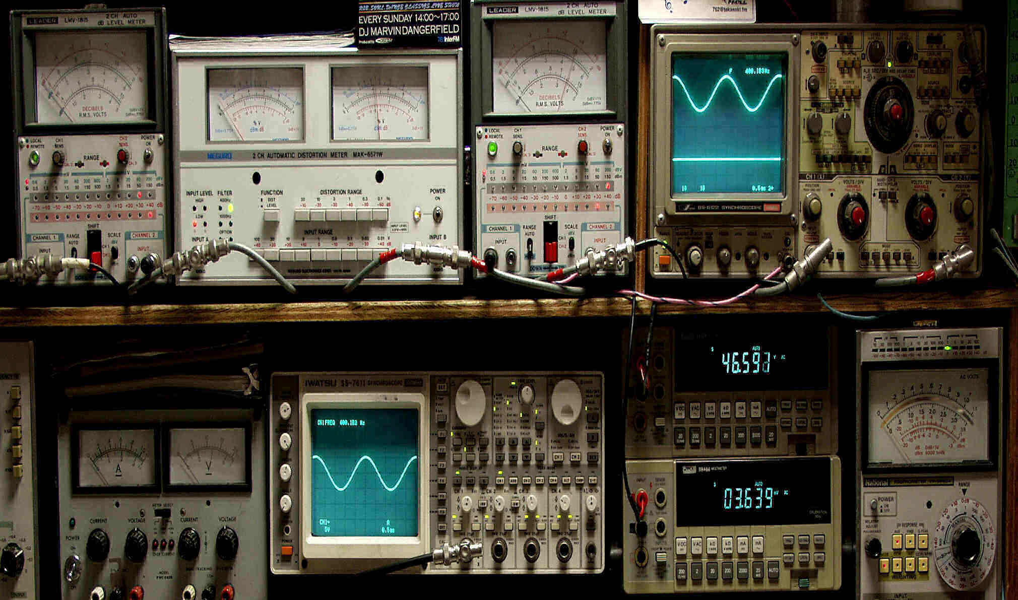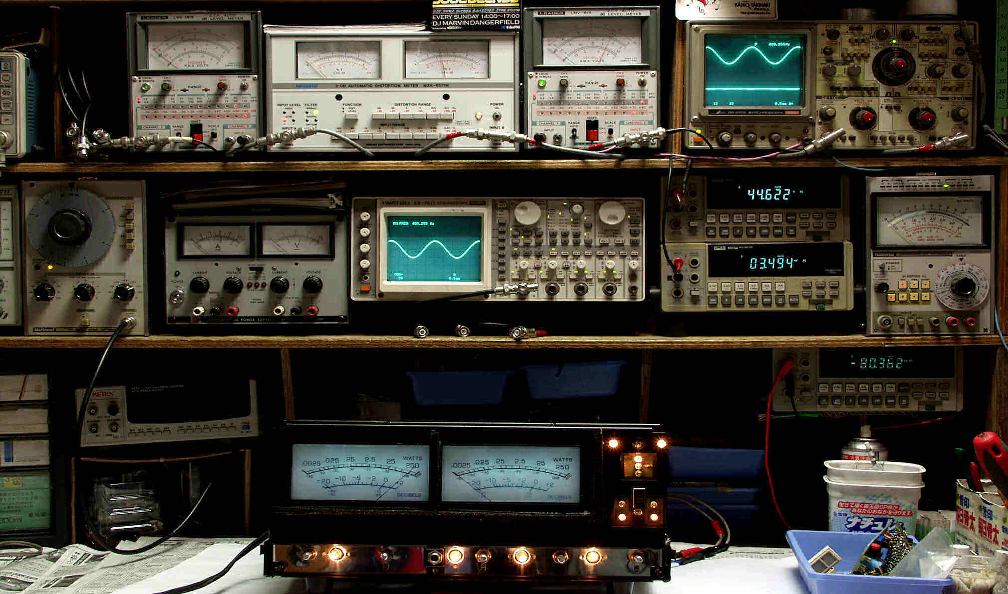 E. 調整・測定 E1. 出力・歪み率測定 <見方> 下段左端 オーディオ発振器より400HZ・1KHZの信号を出し(歪み率=約0.003%)これをAMPに入力し、出力を測定 下段中左 オシロ=入力波形(オーディオ発振器のTTLレベル) 下段中右上=周波数計 上段左端 電圧計=L側出力電圧測定、黒針のみ使用 上段中左 歪み率計=出力の歪み率測定 左メータ=L出力、右メータ=R出力 上段中右 電圧計=R側出力電圧測定、赤針のみ使用 上段右端 オシロ=出力波形 上=R出力、下=L出力(実際にはRL電圧計の出力「Max1V」を観測) 下段中右上 デジタル電圧計=R出力電圧測定 下段中右下 デジタル電圧計=L出力電圧測定 |