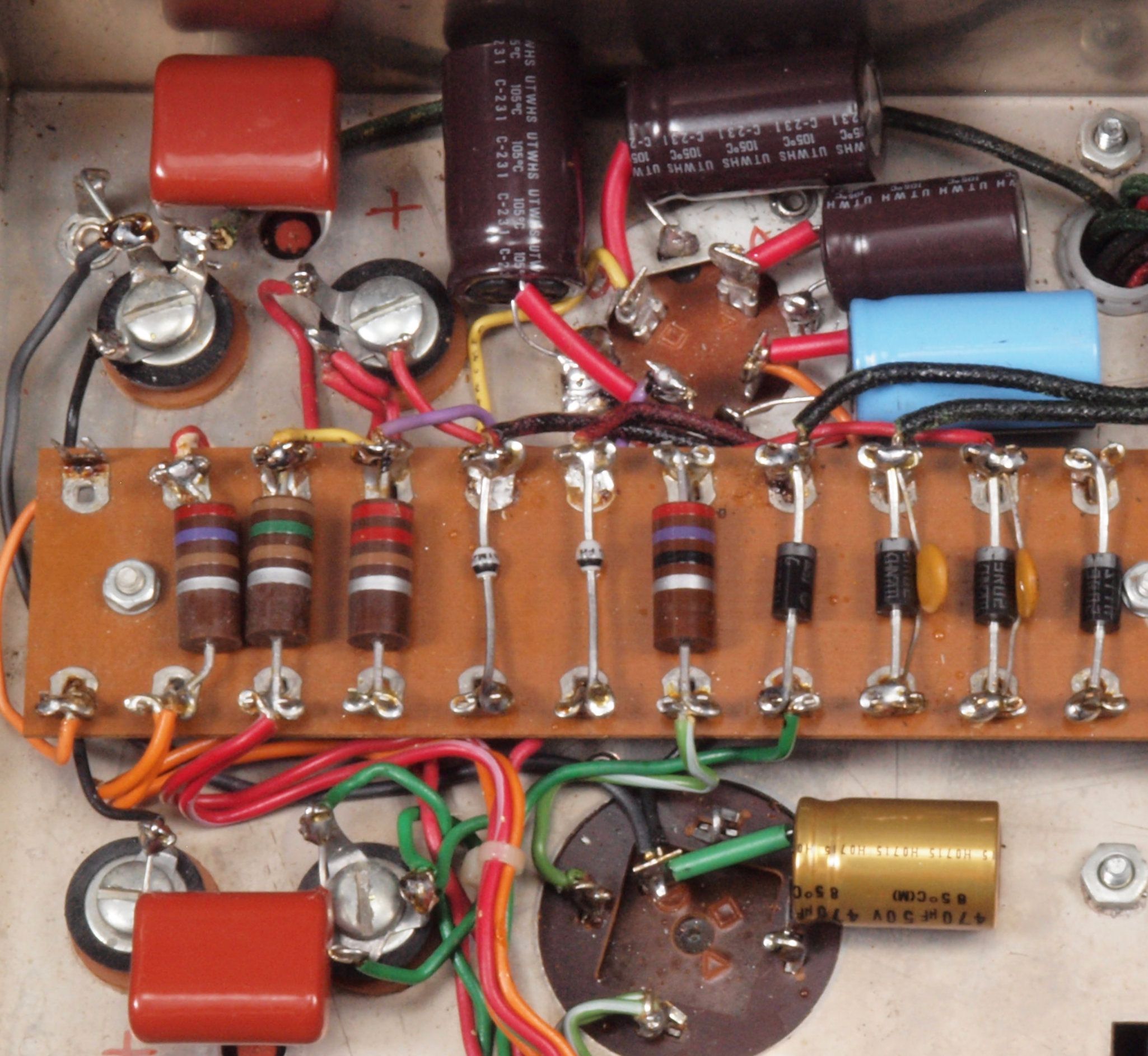 | C34. 修理後 ブロック電解コンデンサー下周り。 整流ダイオード6個、電解コンデンサー5個交換、フイルムコンデンサー2個追加。 | ||||||||||||||||||||||||||||