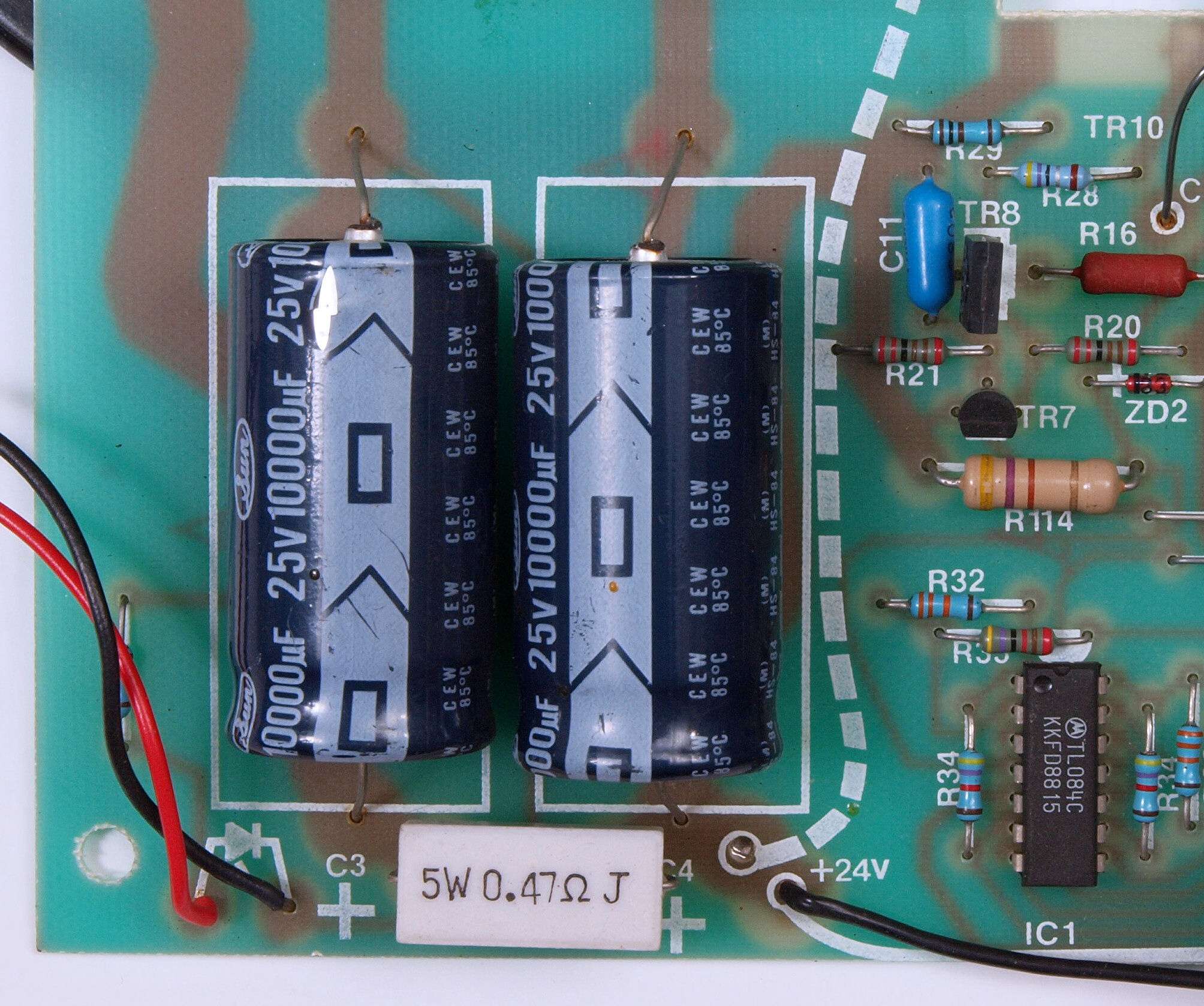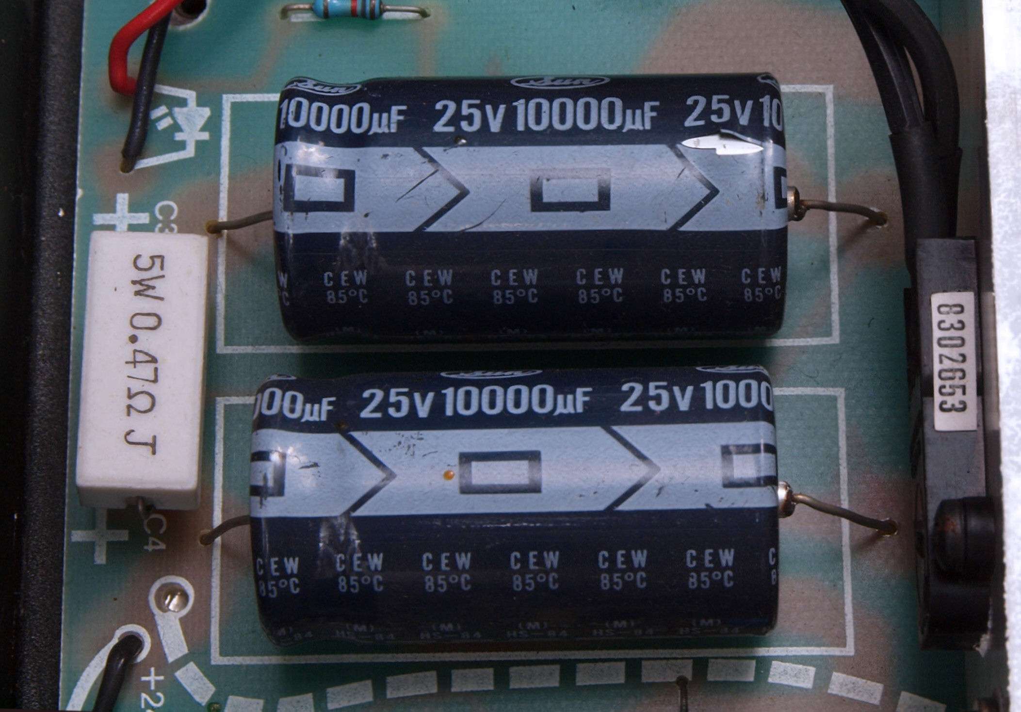 A61. 点検中 電源電解コンデンサーの比較、中=25V/10000μ、両側=交換する、25V/15000μ。