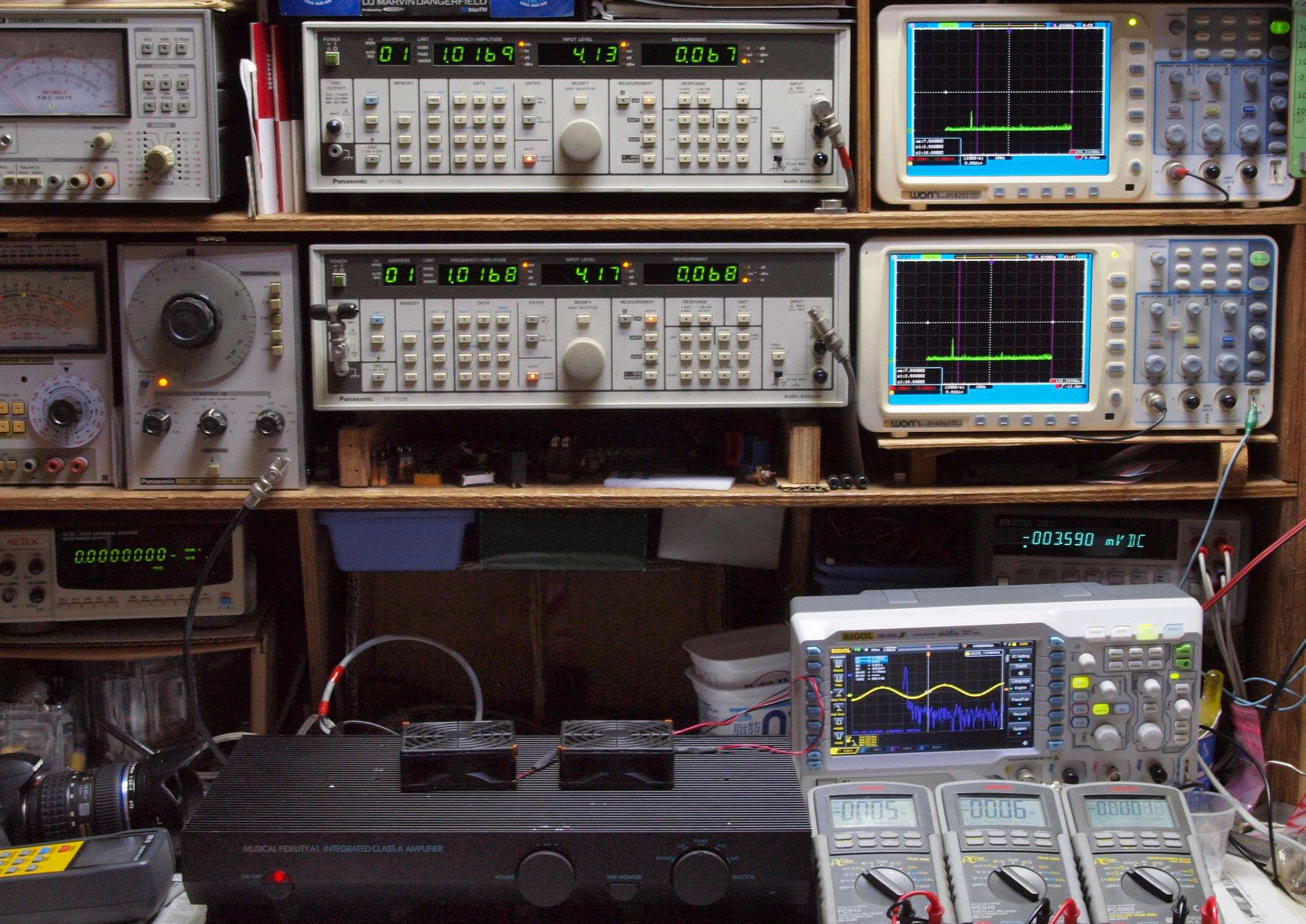 | E. 測定・調整。 画像をクリックすると、大きく(横幅2050ドット)表示されます。 E0. 出力・歪み率測定・調整 「見方」。 上段中 右側SP出力を「Audio Analyzer Panasonic VP−7723B」により測定。 表示LED、 左端=メモリーNo、 中左=周波数測定、 中右=出力電圧測定、 右端=歪み率測定。 上段右端 VP−7723Bの基本波除去出力を「owon SDS8202(200MHZ)」で「FFT分析」表示。 下段中 左側SP出力を「Audio Analyzer Panasonic VP−7723B」により測定。 表示LED、 左端=メモリーNo、 中左=周波数測定、 中右=出力電圧測定、 右端=歪み率測定。 下段右端 VP−7723Bの基本波除去出力を「owon SDS6062(200MHZ)」で「FFT分析」表示。 下段左端 オーディオ発振器 VP−7201A より50Hz〜100kHzの信号を出し(歪み率=約0.003%)、ATT+分配器を通し、AMPに入力。 よって、ダイアル設定出力レベルより低くなります。測定機器の仕様や整備の様子はこちら、「VP−7723B」「VP−7201A」。 FFT画面の見方はこちら。 |