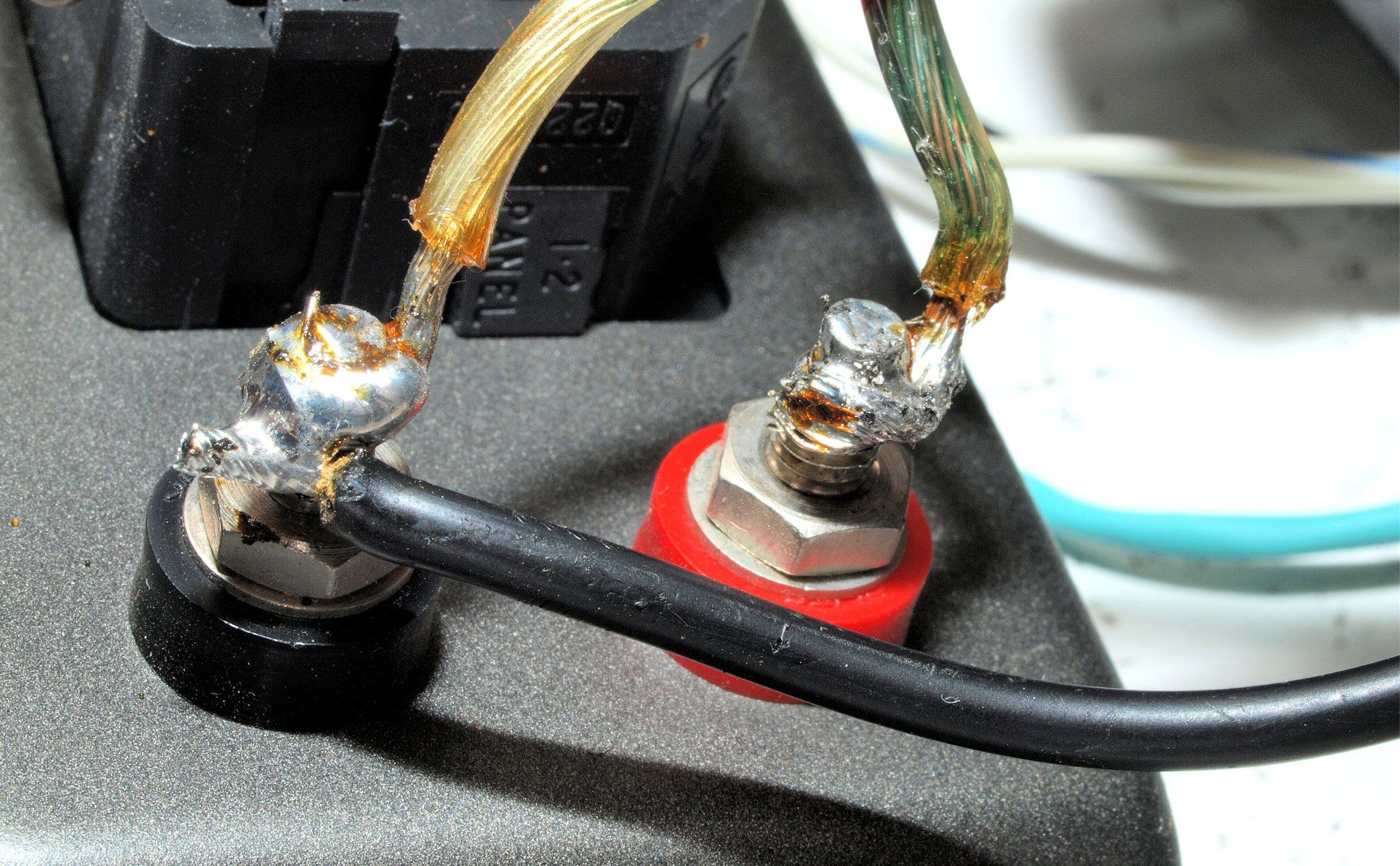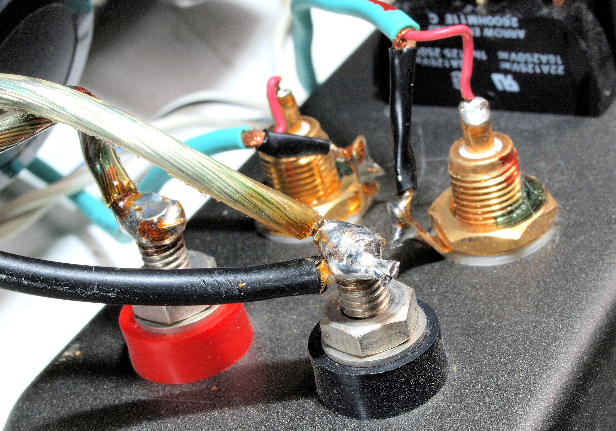 C46. 修理中 端子パネル裏上から見る、 太い電源コードを付けても良いように、ホットボンドで固定する。