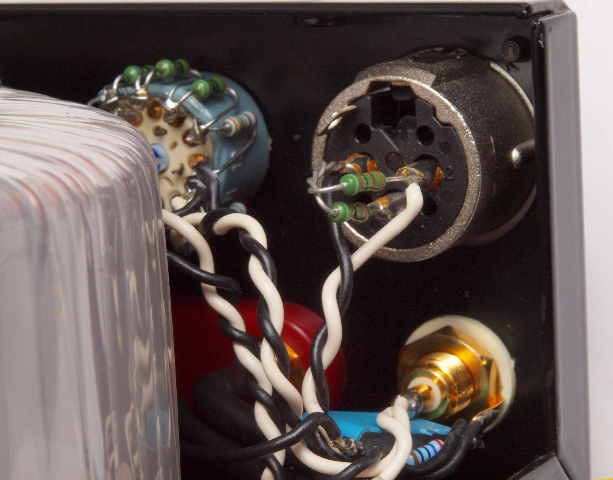 | A19. 点検中 上蓋を取り、上から見る。 XLRバランス入力端子裏配線、3番コールドは未接続。 | ||||||||||||||||||