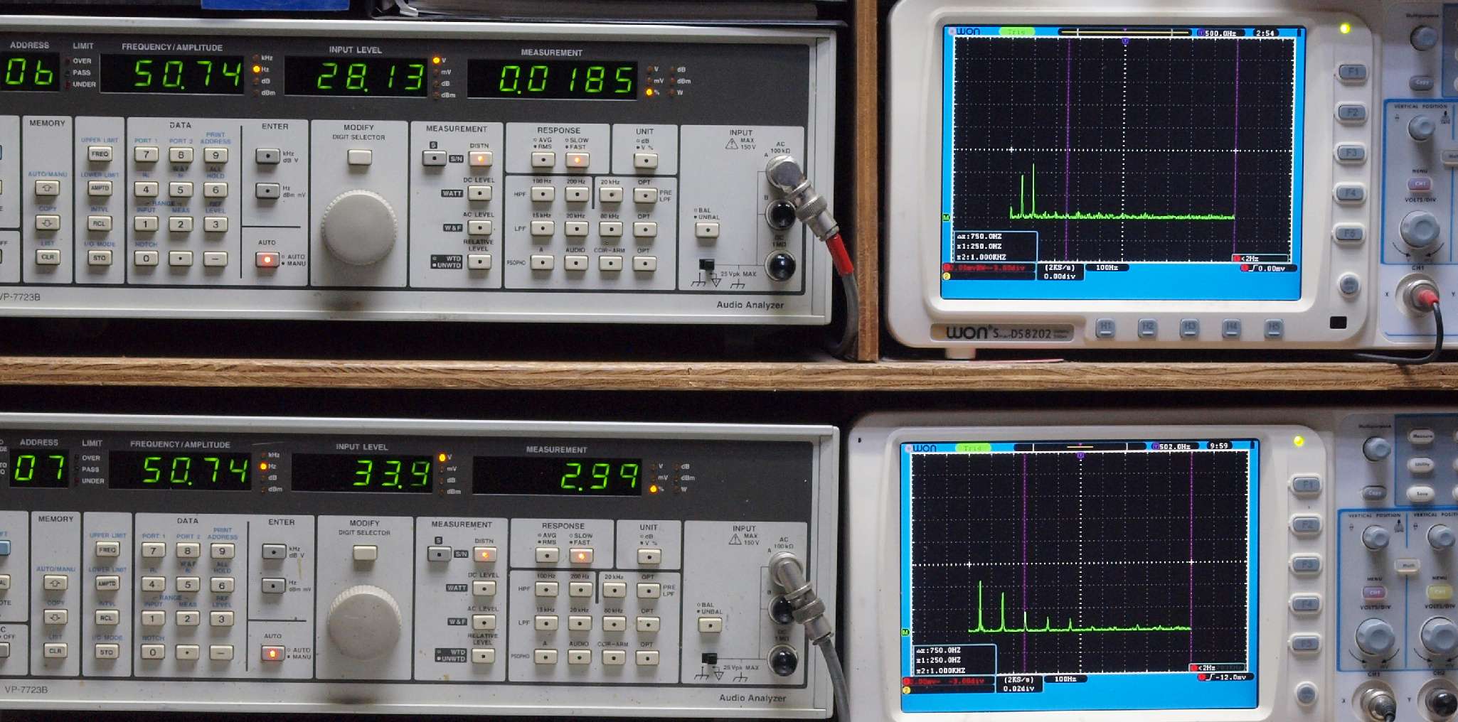 | E. 測定。 画像をクリックすると、大きく(横幅2050ドット)表示されます。 E0. 出力・歪み率測定・調整 「見方」。 上段中 右側SP出力を「Audio Analyzer Panasonic VP−7723B」により測定。 表示LED、 左端=メモリーNo、 中左=周波数測定、 中右=出力電圧測定、 右端=歪み率測定。 上段右端 VP−7723Bの基本波除去出力を「owon SDS8202(200MHZ)」で「FFT分析」表示。 下段中 左側SP出力を「Audio Analyzer Panasonic VP−7723B」により測定。 表示LED、 左端=メモリーNo、 中左=周波数測定、 中右=出力電圧測定、 右端=歪み率測定。 下段右端 VP−7723Bの基本波除去出力を「owon SDS6062(200MHZ)」で「FFT分析」表示。 下段左端 オーディオ発振器 VP−7201A より50Hz〜100kHzの信号を出し(歪み率=約0.003%)、ATT+分配器を通し、AMPに入力。 よって、ダイアル設定出力レベルより低くなります。測定機器の仕様や整備の様子はこちら、「VP−7723B」「VP−7201A」。 FFT画面の見方はこちら。 |