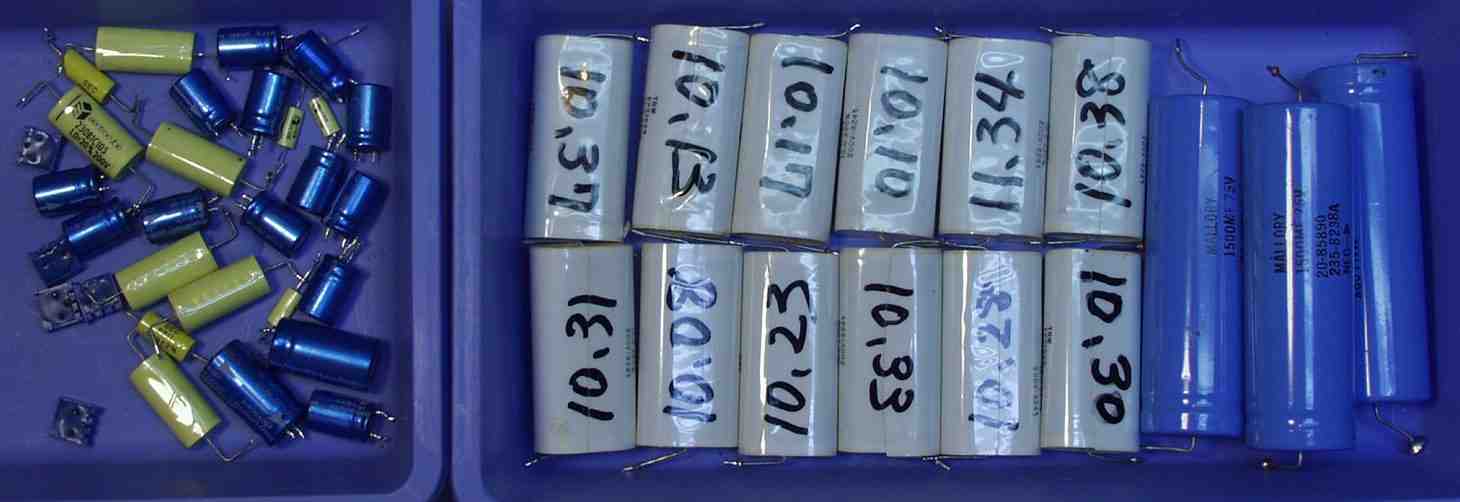 A−1. 修理前 フイルムコンデンサーの比較  下=着いている物=200V耐圧 容量10μ 誤差20%