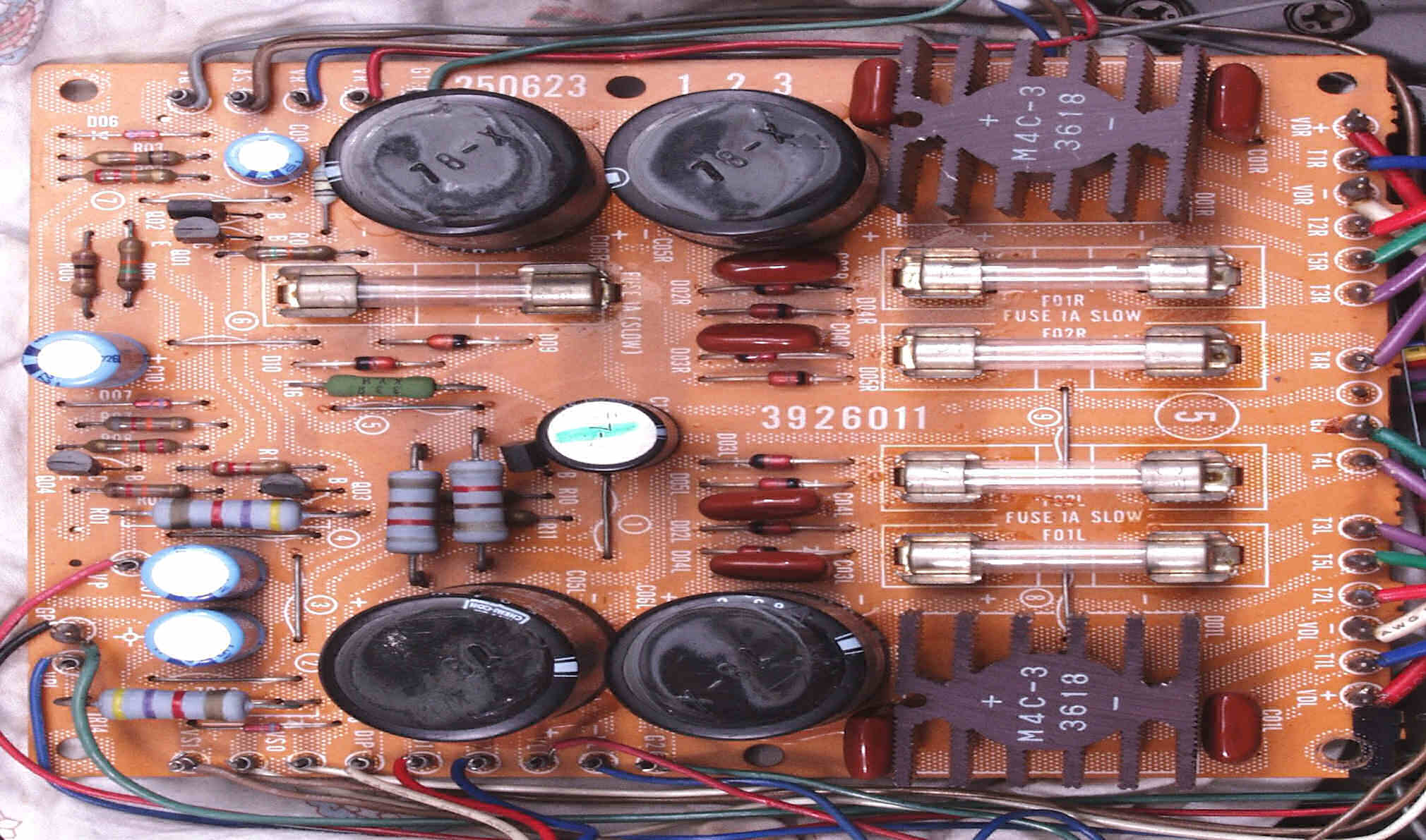 | C4B. 修理後 電源基盤 電解コンデンサー9個、フューズ入り抵抗交換、フイルムコンデンサー4個追加 |