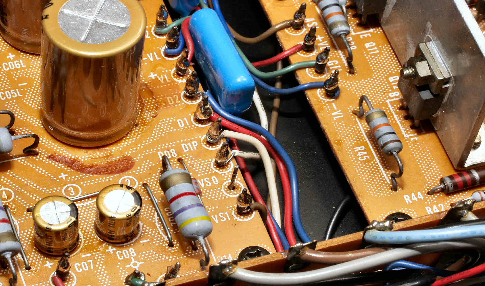 | A2B. 修理前見積り点検中 L側AMP基板の電解コンデンサーが熱のため、頭のビニールが剥けた。 |