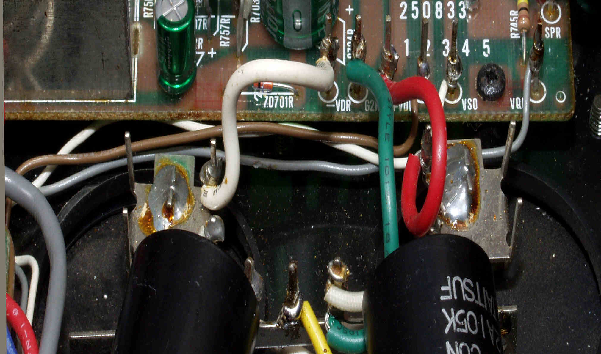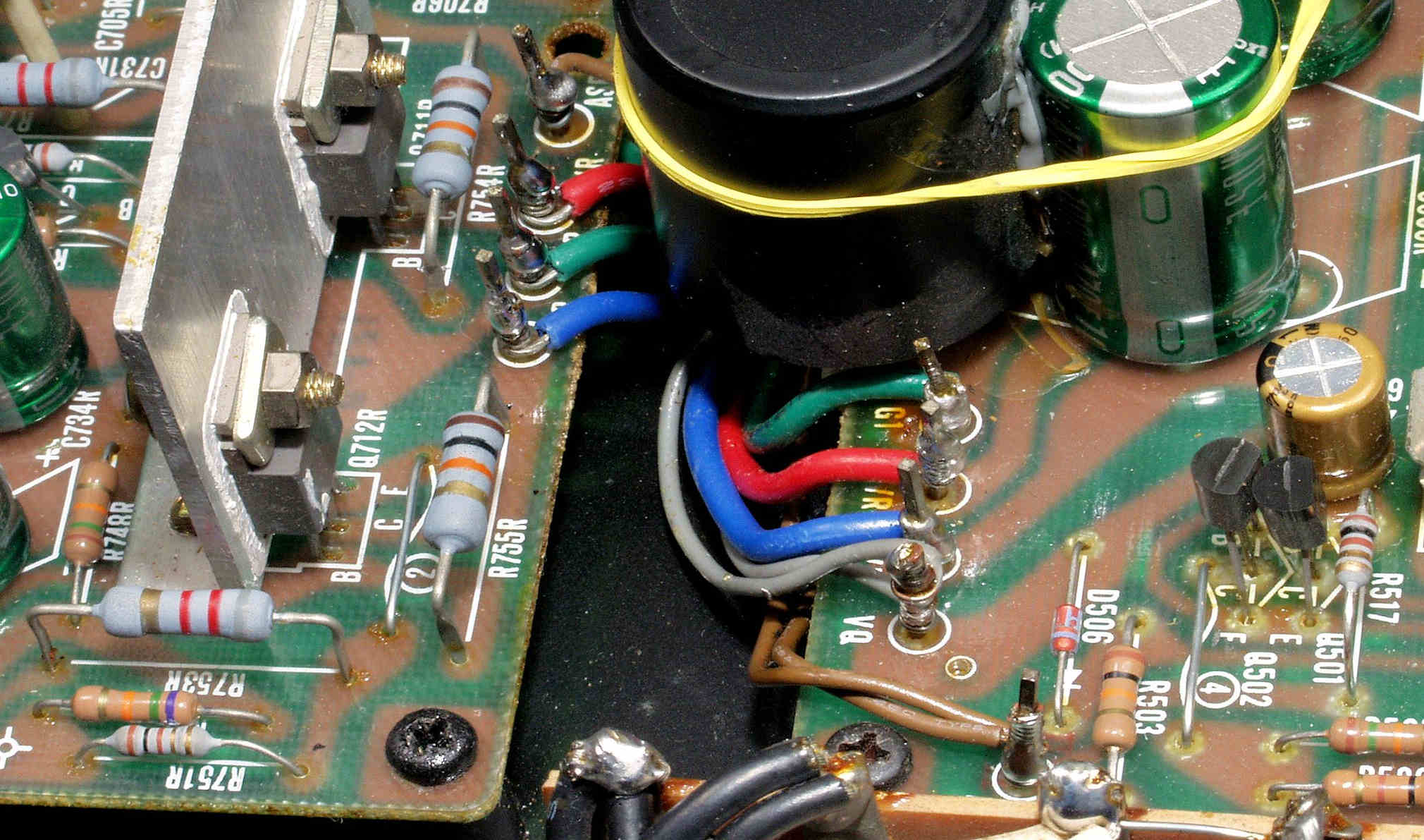 | C7C. 修理後 R側ドライブ基板−電源基板へのラッピング線に半田を浸み込ませる |