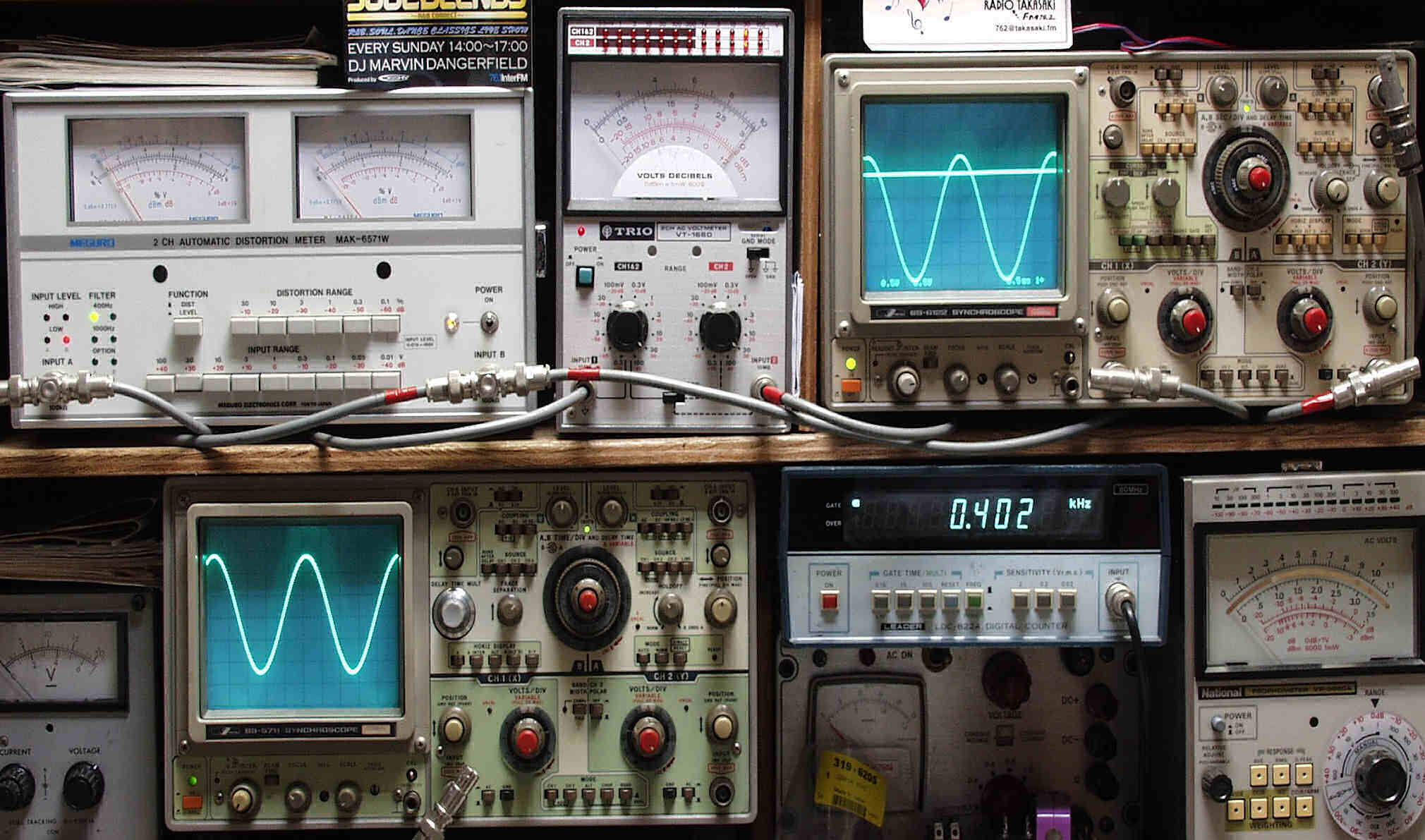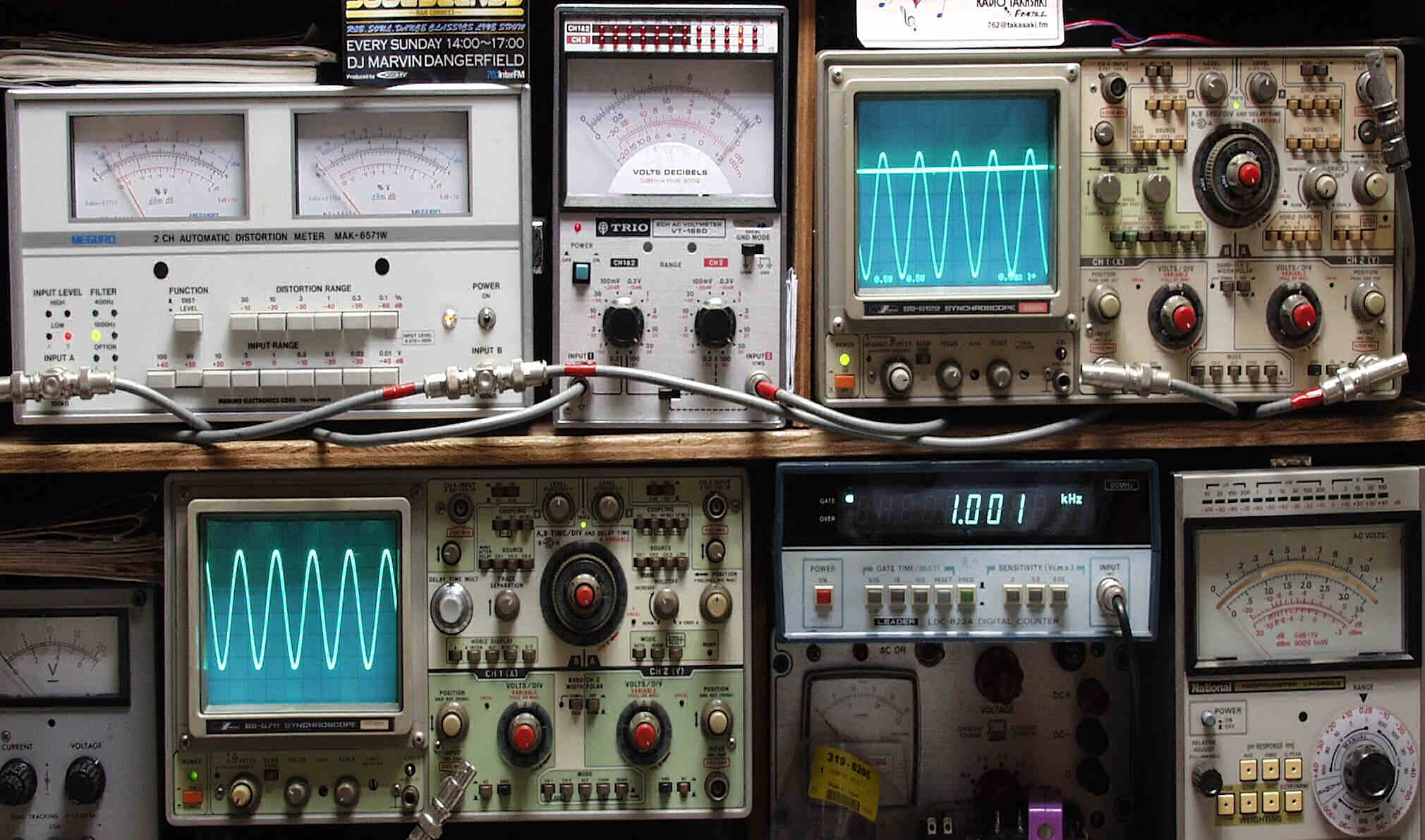 | E. 調整・測定 E1. 出力/歪み率測定・調整 <見方> 下左端オーディオ発振器より400HZ・1KHZの信号を出す(歪み率=約0.003%) 下中=入力波形(オーディオ発振器のTTLレベル) 下中右=周波数計 上中左=SP出力の歪み率測定 左メータ=L出力、右メータ=R出力 上中右=SP出力電圧測定器、赤針=R出力、黒針=L出力 上右端=SP出力波形オシロ 上=R出力、下=L出力(出力電圧測定器の出力) |